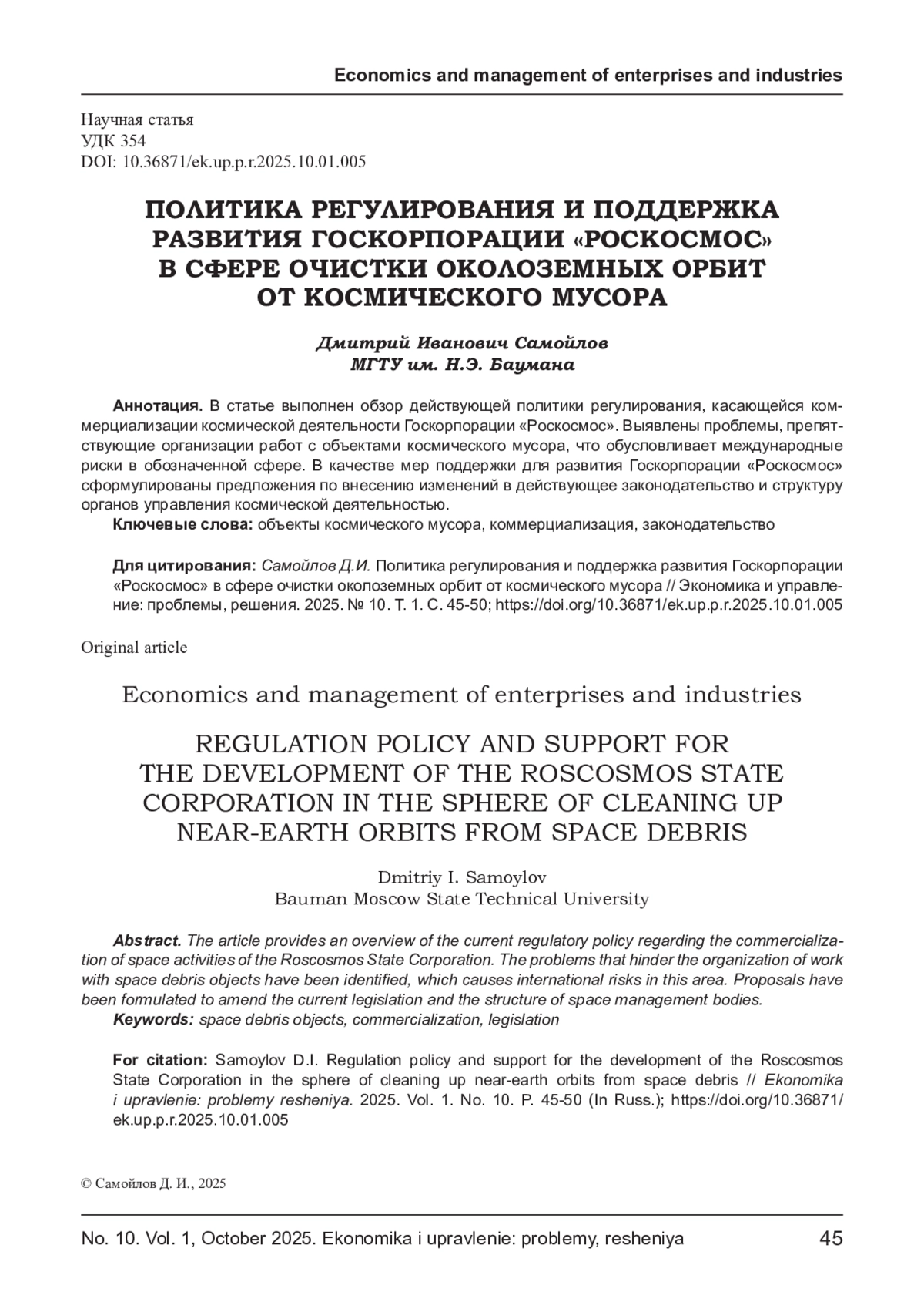 В статье выполнен обзор действующей политики регулирования, касающейся коммерциализации космической деятельности Госкорпорации «Роскосмос». Выявлены проблемы, препятствующие организации работ с объектами космического мусора, что обусловливает международные риски в обозначенной сфере. В качестве мер поддержки для развития Госкорпорации «Роскосмос» сформулированы предложения по внесению изменений в действующее законодательство и структуру органов управления космической деятельностью.