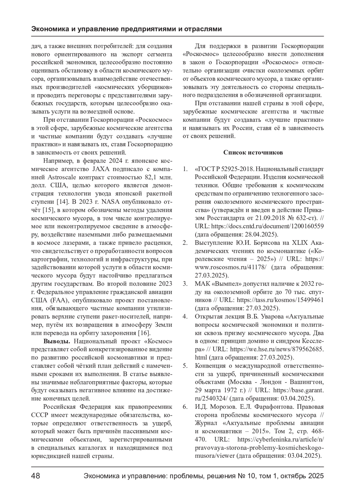 6. И.Д. Морозов. Е.Л. Фарафонтова. Правовая сторона проблемы космического мусора // Журнал “Актуальные проблемы авиации и космонавтики - 2015”. Том 2, стр. 468470. URL: https://cyberleninka.ru/article/n/pravovaya-storona-problemy-kosmicheskogomusora/viewer (дата обращения: 03.04.2025).