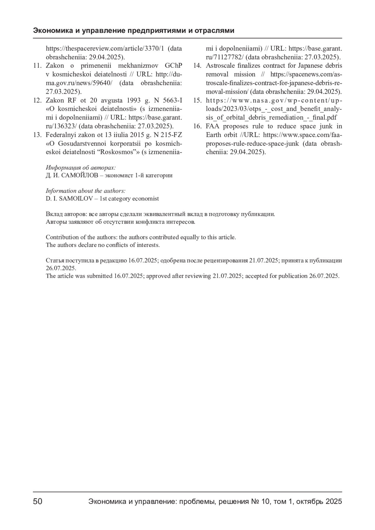 14. Astroscale finalizes contract for Japanese debris removal mission // https://spacenews.com/astroscale-finalizes-contract-for-japanese-debrisremoval-mission/(дата обращения: 29.04.2025).