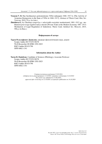 8. Есаян В. Б. Деятельность армянской буржуазии в Тифлисской губернии в 1846-1917 гг.: Автореф. дис. … канд. ист. наук. Ереван, 2019. 25 с. (на арм. яз.)
