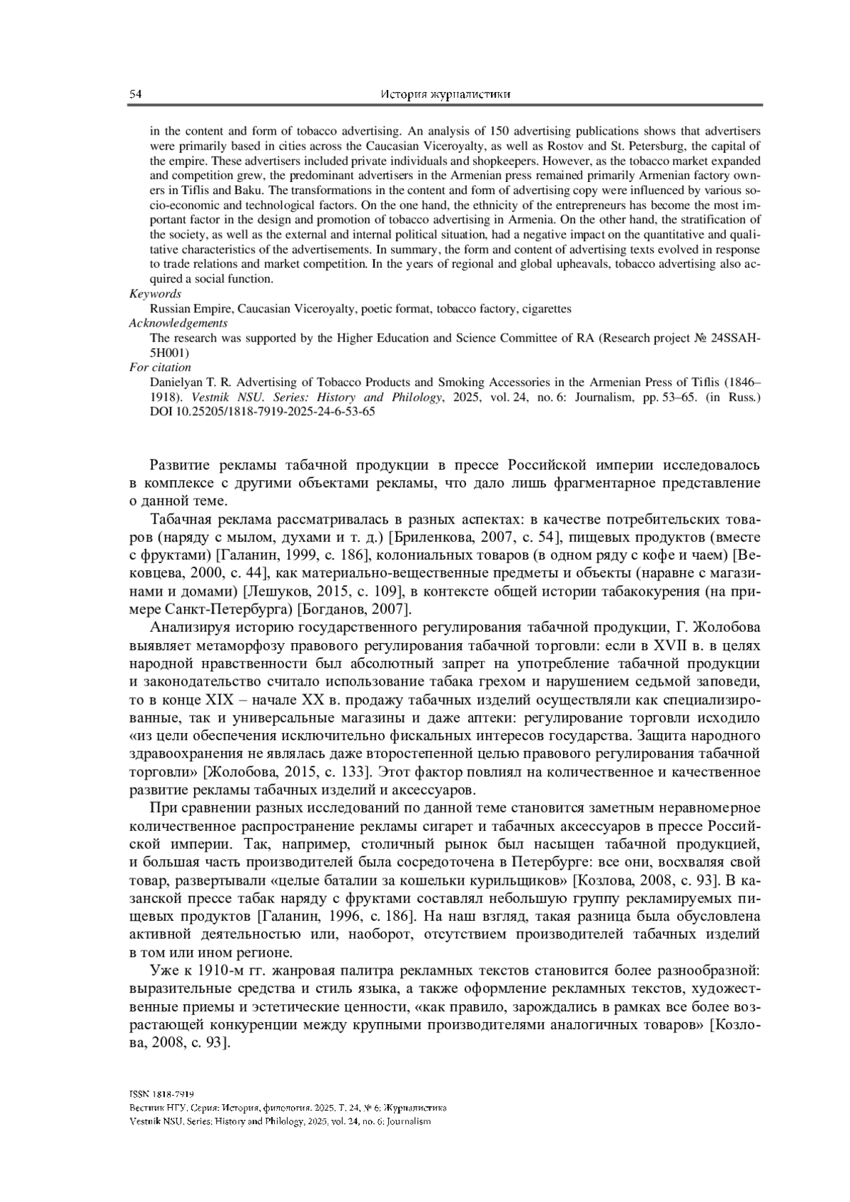 7. Даниелян Т. Р., Тадевосян Т. В. Стихотворный текст как формат рекламы (на примере рекламы коньяка фирмы «Н. Л. Шустов и сыновья» в газете «Кавказ») // Вестник Том. гос. ун-та. 2023. № 488. С. 111-119. https://doi.org/10.17223/15617793/488/11