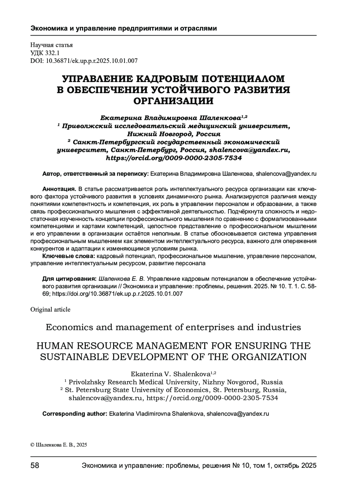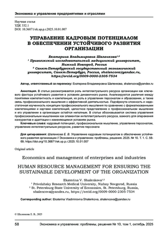 В статье рассматривается роль интеллектуального ресурса организации как ключевого фактора устойчивого развития в условиях динамичного рынка. Анализируются различия между понятиями компетентность и компетенция, их роль в управлении персоналом и образовании, а также связь профессионального мышления с эффективной деятельностью. Подчёркнута сложность и недостаточная изученность концепции профессионального мышления по сравнению с формализованными компетенциями и картами компетенций, целостное представление о профессиональном мышлении и его управлении в организации остаётся неполным. В статье обосновывается система управления профессиональным мышлением как элементом интеллектуального ресурса, важного для опережения конкурентов и адаптации к изменяющимся условиям рынка.