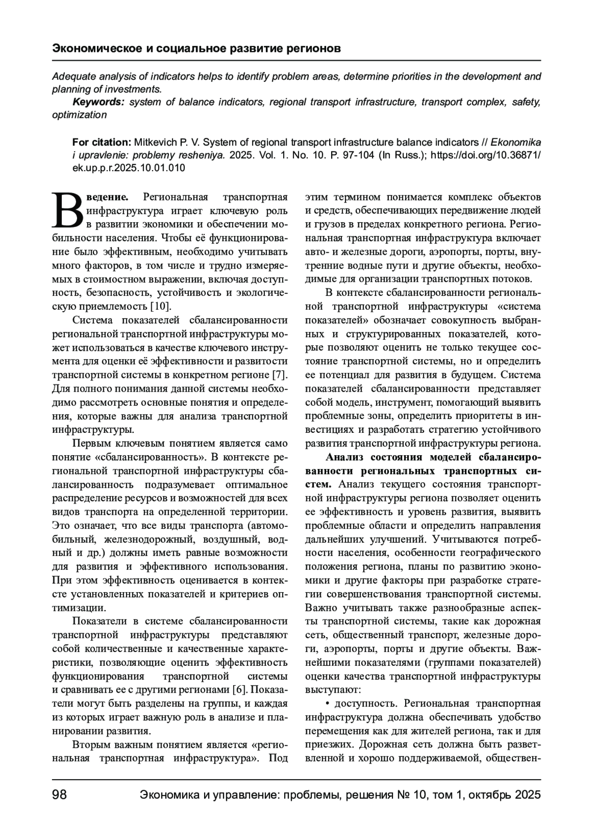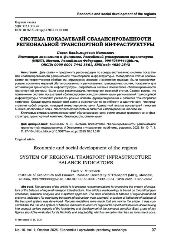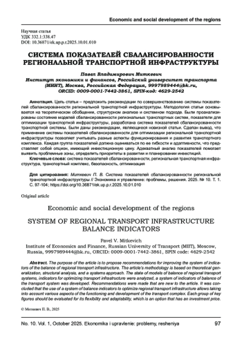 Цель статьи - предложить рекомендации по совершенствованию системы показателей сбалансированности региональной транспортной инфраструктуры. Методология статьи основывается на теоретическом обобщении, структурном анализе и системном подходе. Были проанализированы состояние моделей сбалансированности региональных транспортных систем, показатели для оптимизации транспортной инфраструктуры, разработана система показателей сбалансированности транспортной системы. Были даны рекомендации, являющиеся новизной статьи. Сделан вывод, что применение системы показателей сбалансированности для оптимизации региональной транспортной инфраструктуры позволяет учитывать разные аспекты функционирования и развития транспортного комплекса. Каждая группа показателей должна оцениваться по ее гибкости и адаптивности, что представляет собой опцион, имеющий инвестиционную цену. Адекватный анализ показателей помогает выявить проблемные зоны, определить приоритеты в развитии и планировании инвестиций.