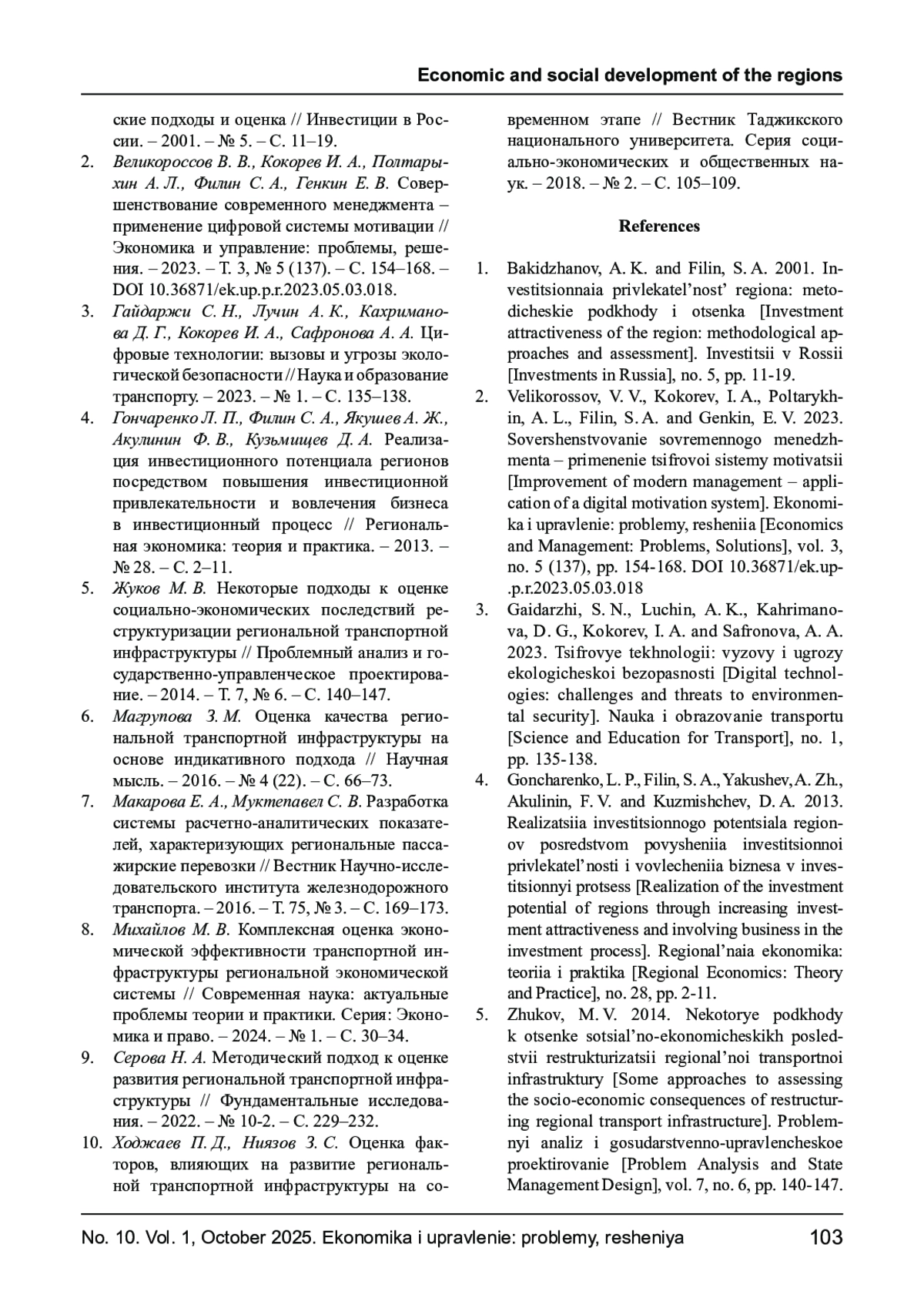 10. Ходжаев П. Д., Ниязов З. С. Оценка факторов, влияющих на развитие региональной транспортной инфраструктуры на современном этапе // Вестник Таджикского национального университета. Серия социально-экономических и общественных наук. - 2018. - № 2. - С. 105-109. EDN: UQKMTM