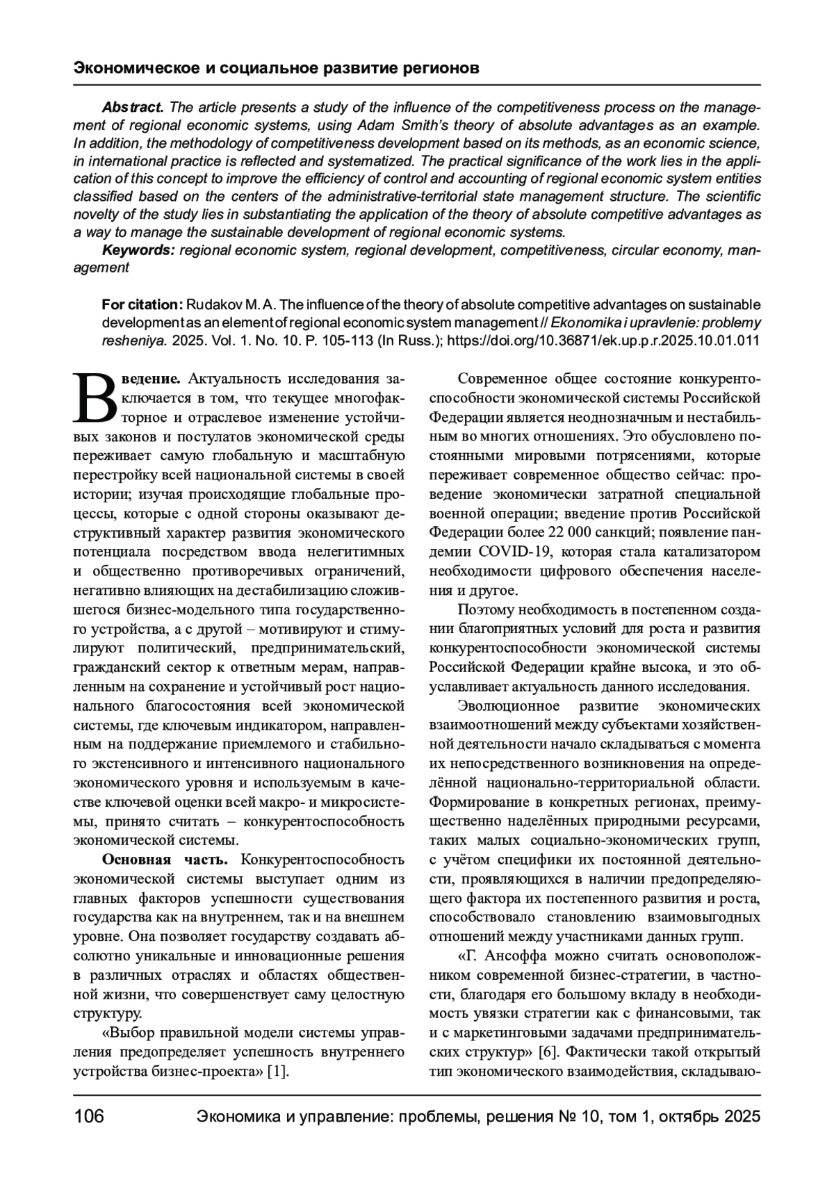В статье представлено исследование влияния процесса конкурентоспособности на управление региональными экономическими системами на примере теории абсолютных преимуществ Адама Смита. Кроме того, отражена и систематизирована методология развития конкурентоспособности на основе ее методов, как экономической науки, в международной практике. Практическая значимость работы состоит в применении данной концепции для повышения эффективности контроля и учета субъектов региональных экономических систем, классифицированных на основе центров административно-территориальной государственной управленческой структуры. Научная новизна исследования состоит в обосновании применения теории абсолютных конкурентных преимуществ как способа управления устойчивым развитием региональных экономических систем.
