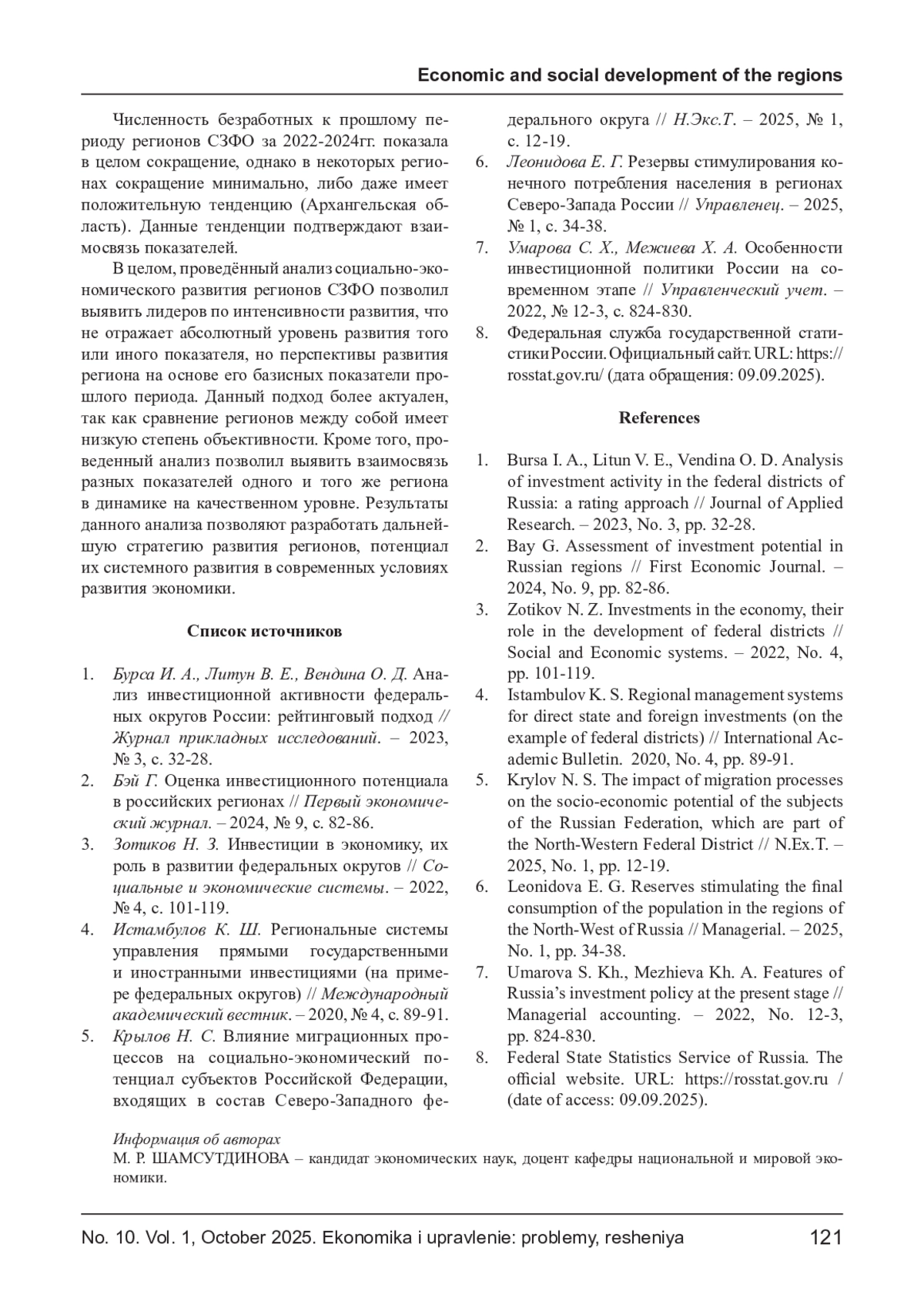 1. Бурса И. А., Литун В. Е., Вендина О. Д. Анализ инвестиционной активности федеральных округов России: рейтинговый подход // Журнал прикладных исследований. - 2023, № 3, с. 32-28.
