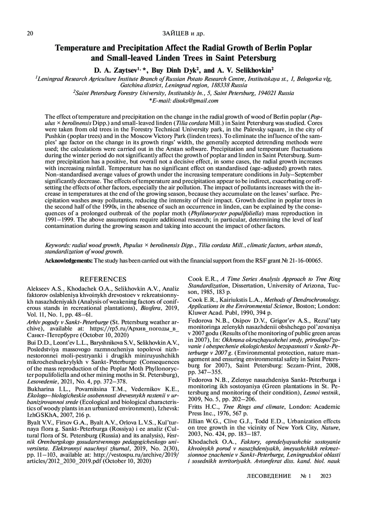 Исследовалось влияние температуры и осадков на изменение радиального прироста древесины тополя берлинского (Populus × berolinensis Dipp.) и липы мелколистной (Tilia cordata Mill.) в Санкт-Петербурге. Керны отобраны со старых деревьев в парке Лесотехнического университета, в Палевском сквере, в г. Пушкине (тополь) и в Московском парке Победы (липа). Для исключения влияния фактора возраста образца на изменение ширины его годичных колец были использованы общепринятые методы детрендинга, расчеты проводились в программном обеспечении Arstan. Колебания осадков и температуры зимнего периода значимо не влияют на рост тополя и липы в Санкт-Петербурге. Летние осадки оказывают положительное, но не определяющее воздействие, в некоторых случаях радиальный прирост древесины увеличивается с ростом количества осадков. Температура не оказывает значимого воздействия на стандартизированные (очищенные от влияния возраста) показатели прироста. Нестандартизированные средние значения прироста при увеличении температуры в июле–сентябре достоверно снижаются. Воздействие температуры и осадков, по-видимому, проявляется опосредованно, усугубляя или сглаживая воздействие других факторов, в особенности фактора загрязнения воздуха. Воздействие загрязняющих веществ усиливается при повышении температуры в конце вегетационного сезона, т. к. происходит их накопление на поверхности листьев. Осадки смывают загрязняющие вещества, снижая интенсивность влияния загрязнения. Снижение прироста во второй половине 1990-х гг. у тополя при отсутствии такового у липы объясняется последствиями продолжительной вспышки массового размножения тополёвой моли – пестрянки (Phyllonorycter populifoliella) в 1991–1999 гг. Высказанные предположения требуют дополнительных исследований, в частности определения уровня загрязнения листьев в течение вегетационного сезона и учета воздействия других факторов