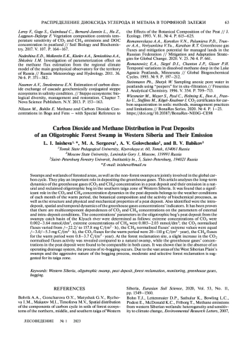 37. Leroy F., Gogo S., Guimbaud C., Bernard-Jannin L., Hu Z., Laggoun-Defarge F. Vegetation composition controls temperature sensitivity of CO2 and CH4 emissions and DOC concentration in peatland // Soil Biology and Biochemistry. 2017. V. 107. P. 164–167.