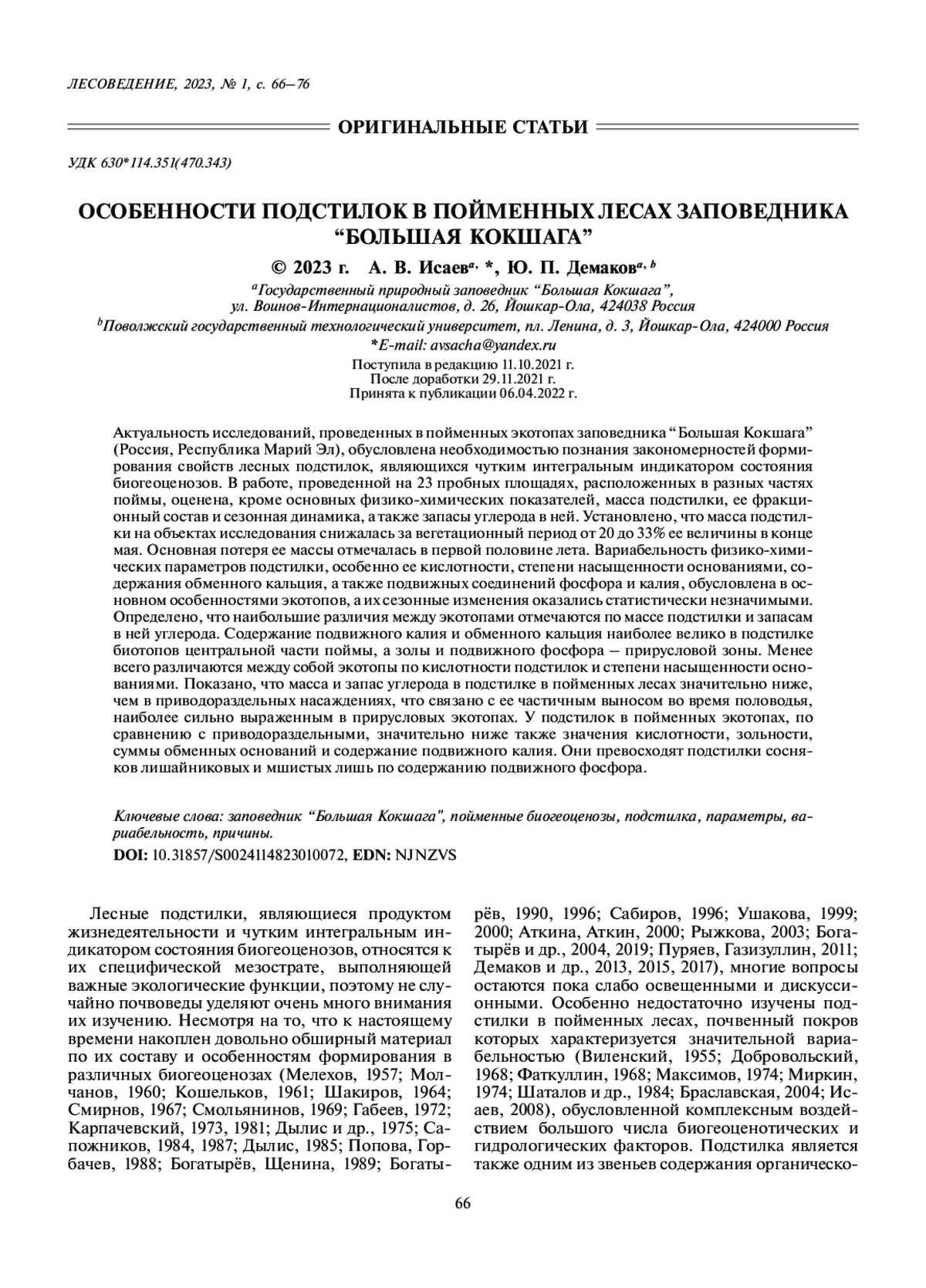 16. Демаков Ю.П., Исаев А.В., Шарафутдинов Р.Н. Роль лесной подстилки в борах Марийского Заволжья и вариабельность ее параметров // Научные труды государственного природного заповедника “Большая Кокшага”. Вып. 8. Йошкар-Ола: ПГТУ, 2017. С. 15-43. EDN: ZWLUAL