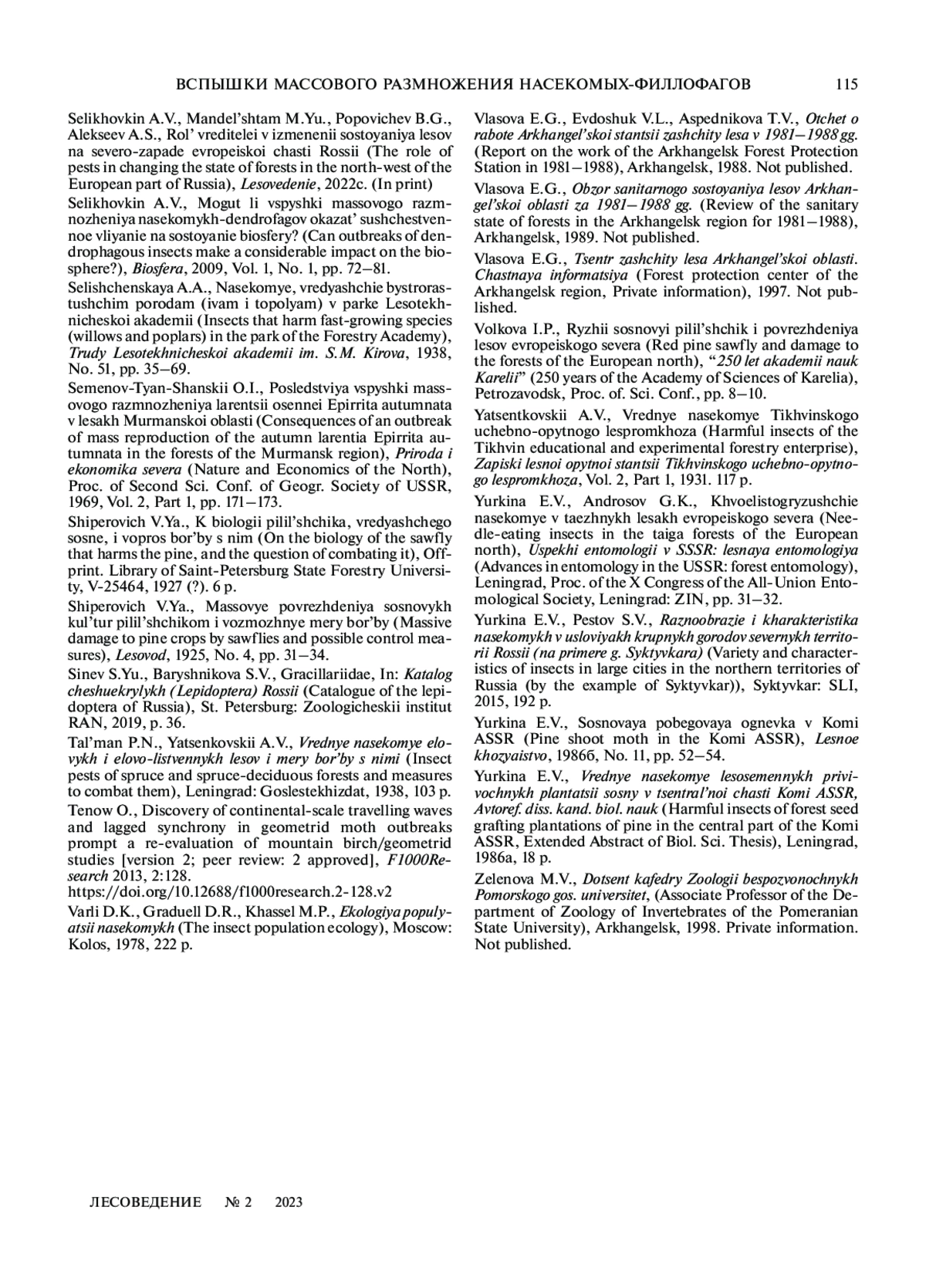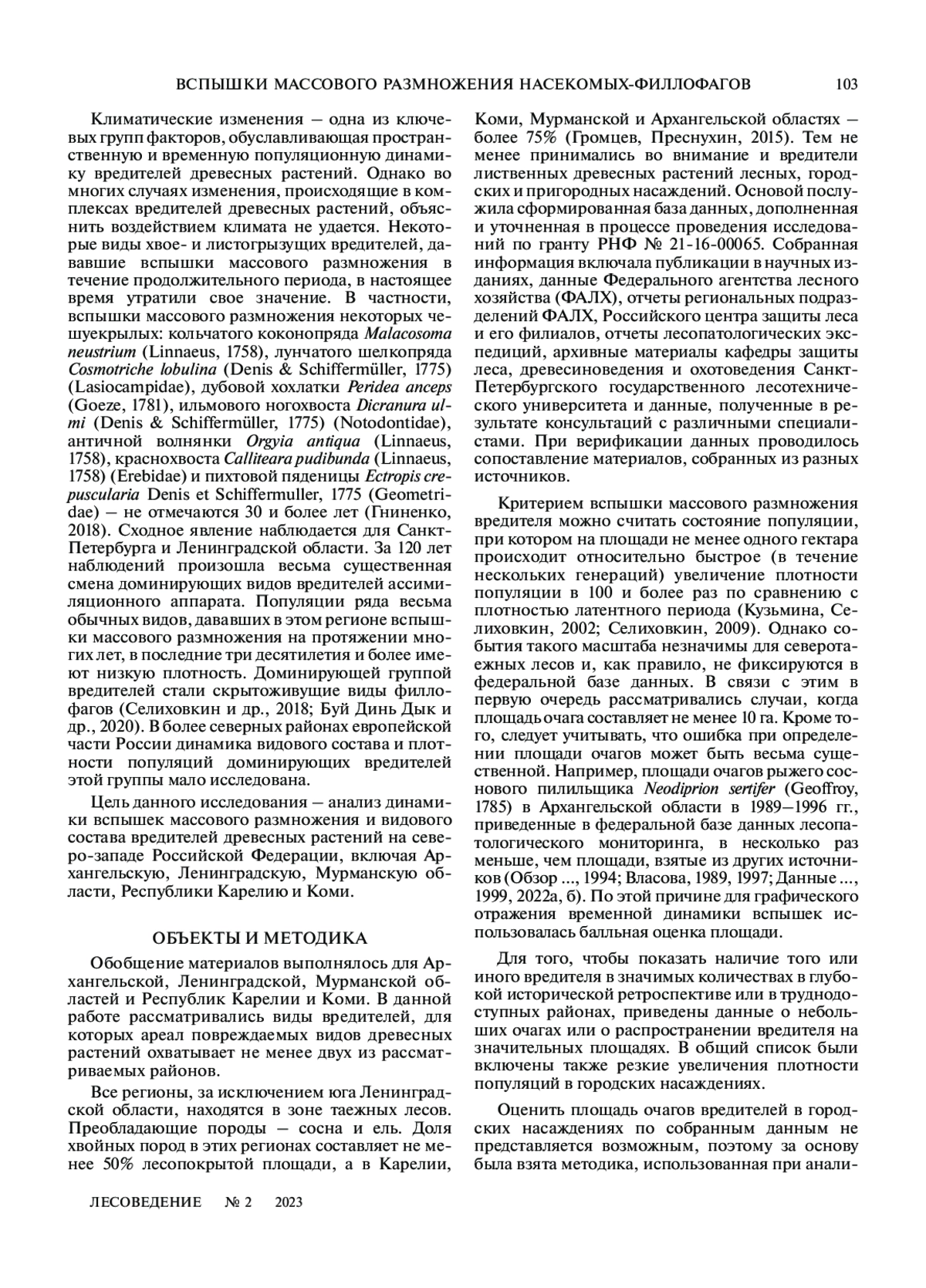 52. Селиховкин А.В., Мандельштам М.Ю., Поповичев Б.Г., Алексеев А.С. Роль вредителей в изменении состояния лесов на северо-западе европейской части России // Лесоведение. 2022в. № 5 (в печати).