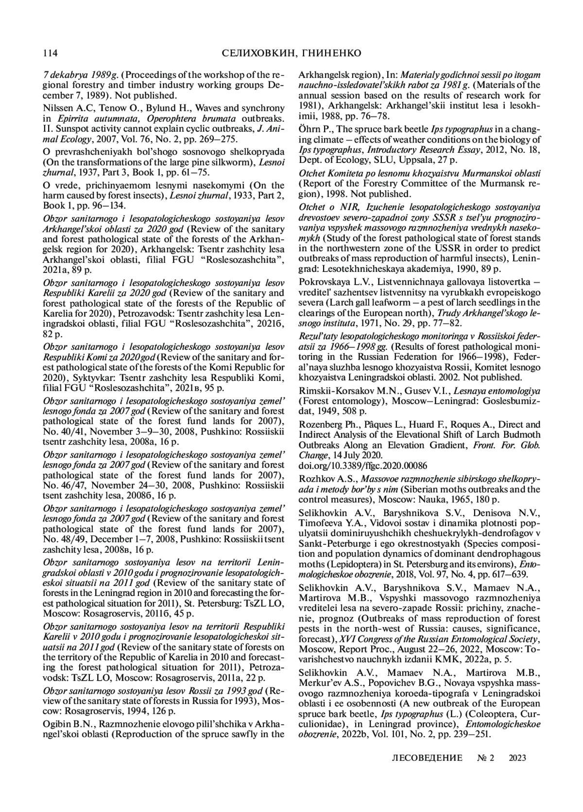 51. Селиховкин А.В., Мамаев Н.А., Мартирова М.Б., Меркурьев А.С., Поповичев Б.Г. Новая вспышка массового размножения короеда-типографа в Ленинградской области и ее особенности // Энтомологическое обозрение. 2022б. Т. 101. № 2. С. 239–251. EDN: HJTBWL