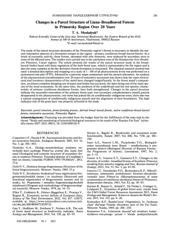 18. Москалюк Т.А. Трансформация травяного яруса за 20 лет восстановительной сукцессии в широколиственных лесах с лиановой растительностью на юге Приморского края // Комаровские чтения, 2021. Вып. LXIX. С. 26–78.
