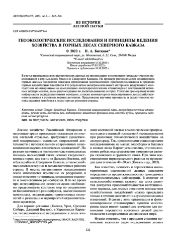 В статье приведен анализ исторических данных по организации и состоянию геоэкологических исследований в горных лесах России и Северного Кавказа. На примере регионального мониторинга горных лесных экосистем показана организация многоцелевого природопользования в пределах горных водосборных бассейнов. По результатам экспериментального материала, полученного многолетним мониторингом на комплексных лесогидрологических стационарах с постановкой активных экспериментов, даны рекомендации по лесопользованию в горах. Показан пример получения информации экспедиционными методами, а также компьютерное моделирование лесохозяйственного освоения в условиях горных регионов. Предложены научные принципы и экологические основы ведения хозяйства в лесах горных регионов страны