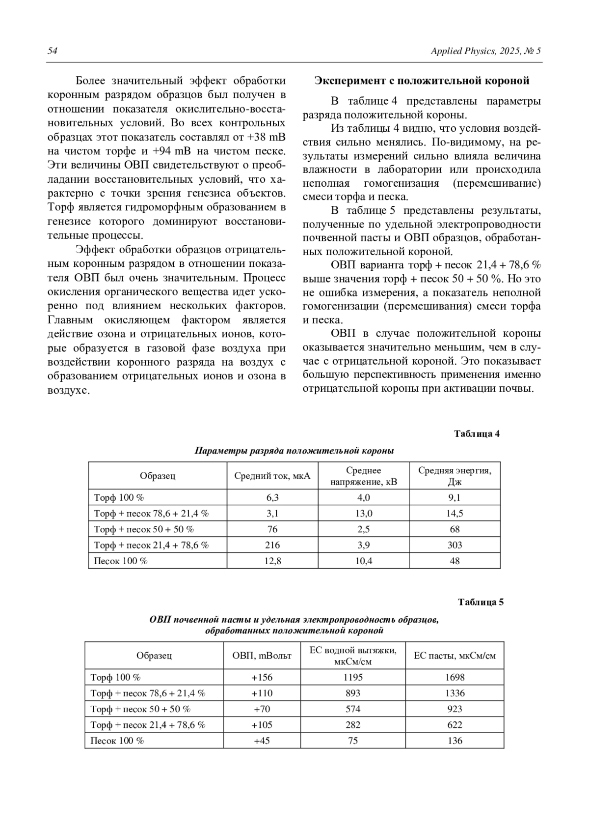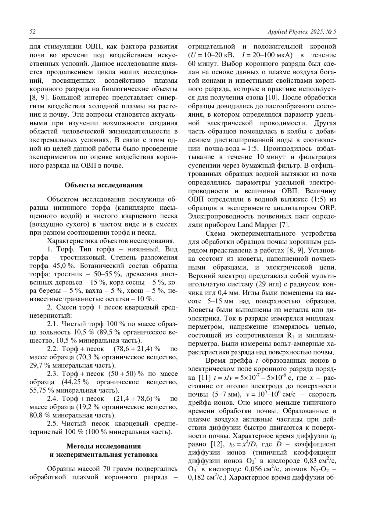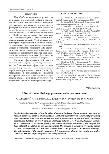 Проведены исследования влияния плазмы коронного разряда на окислительно-восстановительные реакции почвы, а именно на образцы низинного торфа (капилляр-но насыщенного водой) и чистого кварцевого песка (воздушно сухого) в чистом виде и в смесях при разном соотношении торфа и песка. Параметры разряда: время действия до 60 мин, напряжение на разряде U = 10–20 кВ, ток в разряде I = 20–100 мкА. Максимальный эффект обработки коронным разрядом образцов был получен в отношении окислительно-восстановительного потенциала. Процесс окисления органического вещества идет под влиянием озона и отрицательных ионов, образующихся в плазме коронного разряда. Эффективность воздействия отрицательной короны в 2–5 раз выше, чем положительной, что связано с более эффективной наработкой отрицательных ионов.