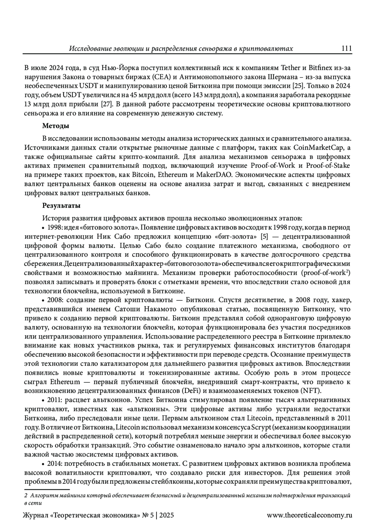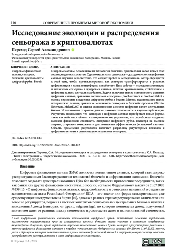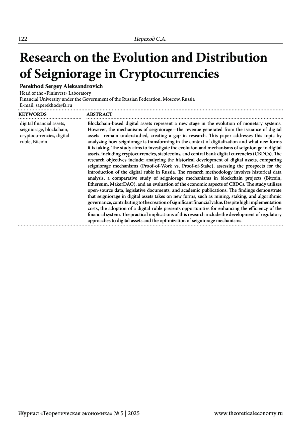 Цифровые активы, основанные на технологии блокчейн, представляют собой новый этап эволюции денежных систем. Однако механизмы сеньоража - дохода от эмиссии цифровых активов изучены недостаточно, что создает пробел в исследованиях. Автор обращается к этой теме, чтобы проанализировать, как сеньораж трансформируется в условиях цифровизации и какие новые формы приобретает. Цель работы - исследовать эволюцию и механизмы сеньоража в цифровых активах, включая криптовалюты, стейблкоины и цифровые валюты центральных банков. Задачи включают анализ исторического развития цифровых активов, сравнение механизмов сеньоража (Proof-of-Work и Proof-of-Stake) и оценку перспектив внедрения цифрового рубля в России. Методы исследования: анализ исторических данных, сравнение механизмов сеньоража в блокчейн-проектах (Bitcoin, Ethereum, MakerDAO) и оценка экономических аспектов цифровых валют центральных банков. Использованы открытые данные, законодательные акты и научные публикации. Результаты показывают, что сеньораж в цифровых активах приобретает новые формы, такие как майнинг, стейкинг и алгоритмическое управление, что способствует созданию высокой финансовой стоимости. Внедрение цифрового рубля, несмотря на высокие затраты, открывает возможности для повышения эффективности финансовой системы. Область применения результатов включает разработку регуляторных подходов к цифровым активам и оптимизацию механизмов сеньоража.