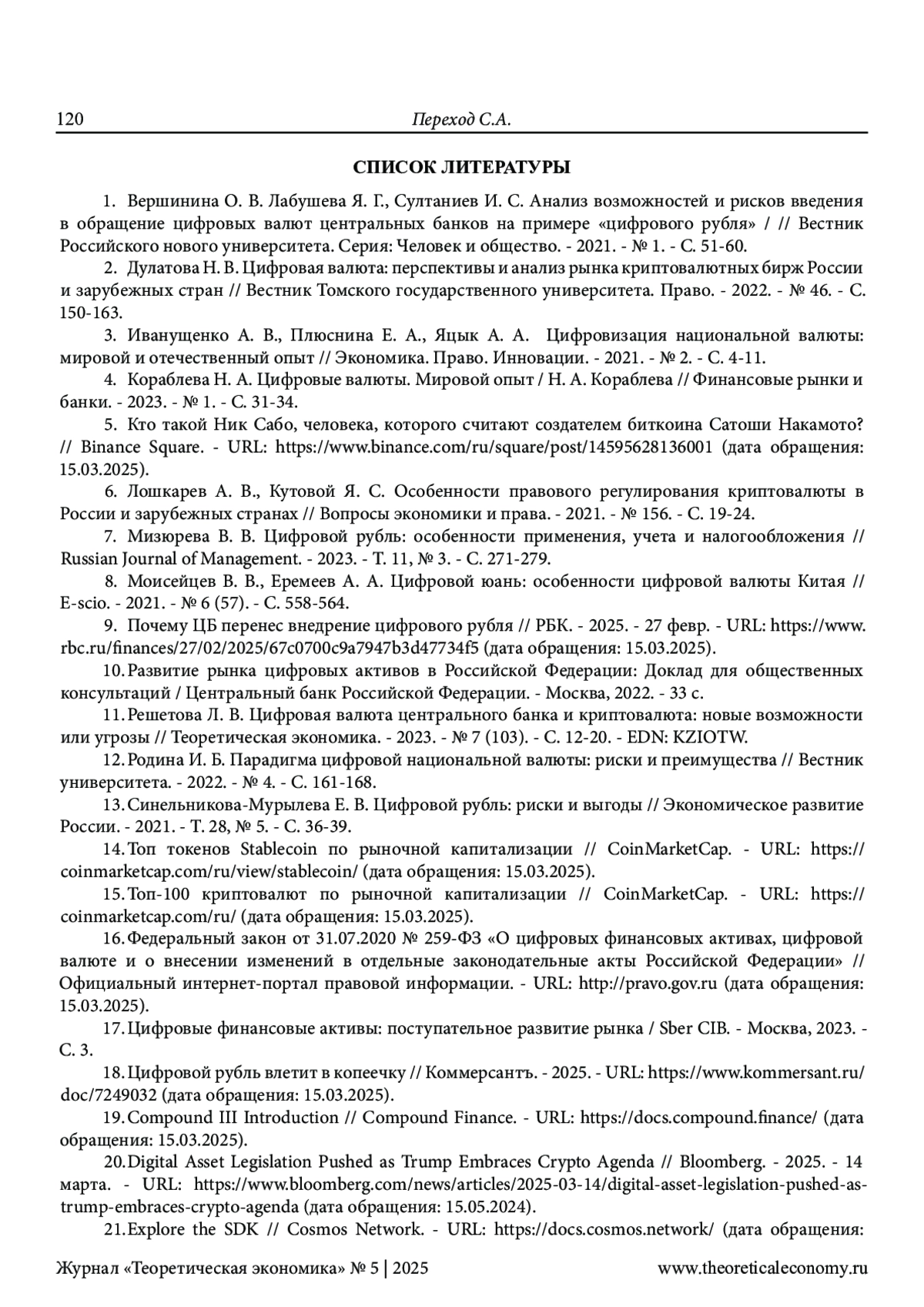 1. Вершинина О. В. Лабушева Я. Г., Султаниев И. С. Анализ возможностей и рисков введения в обращение цифровых валют центральных банков на примере “цифрового рубля” /// Вестник Российского нового университета. Серия: Человек и общество. - 2021. - № 1. - С. 51-60. EDN: IOAHGH