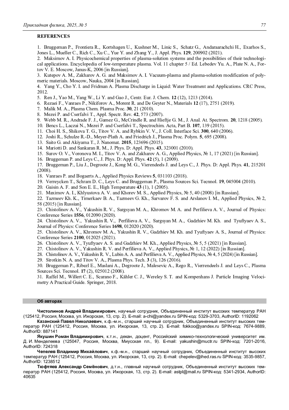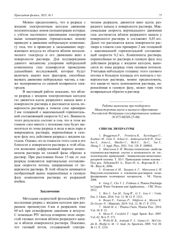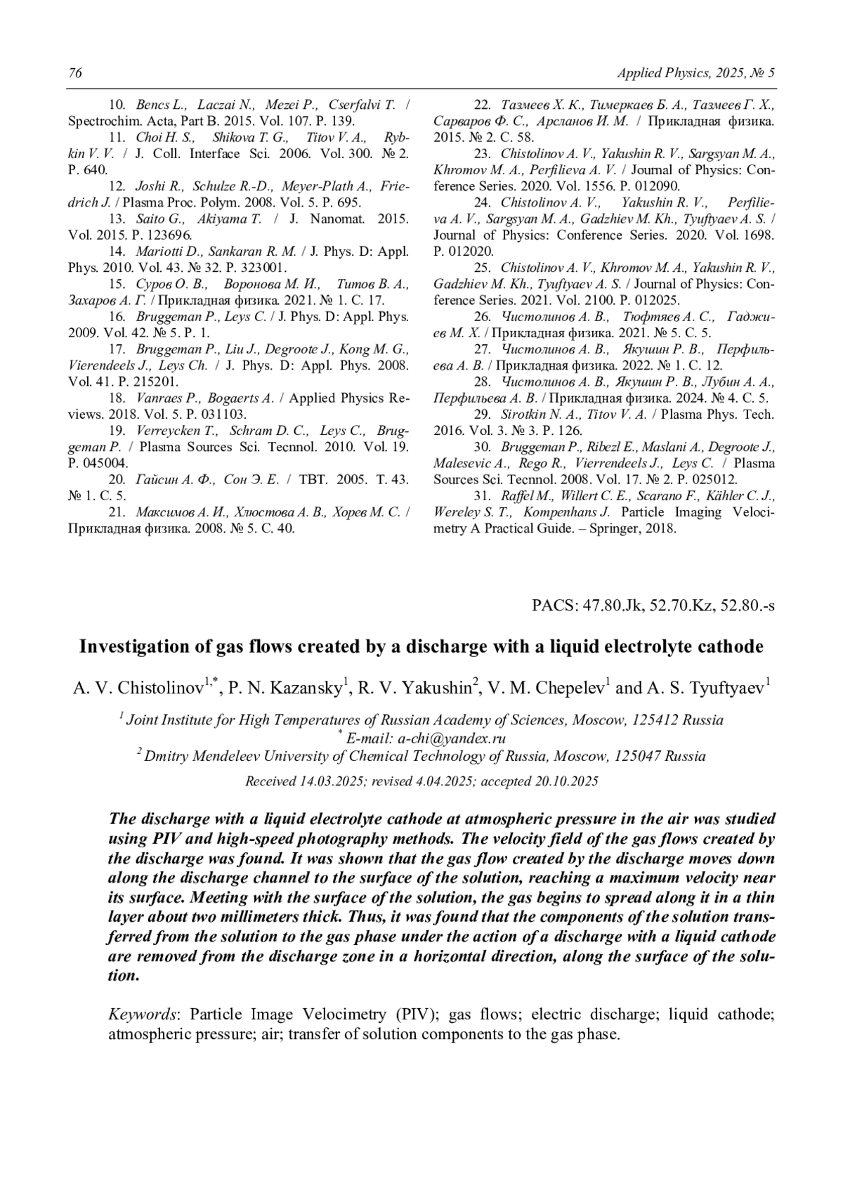 ЧИСТОЛИНОВ А. В., КАЗАНСКИЙ П., ЯКУШИН Р. В., ЧЕПЕЛЕВ В., ТЮФТЯЕВ А. С. ИССЛЕДОВАНИЕ ГАЗОВЫХ ПОТОКОВ, СОЗДАВАЕМЫХ РАЗРЯДОМ С ЖИДКИМ ЭЛЕКТРОЛИТНЫМ КАТОДОМ // ПРИКЛАДНАЯ ФИЗИКА. 2025. №5