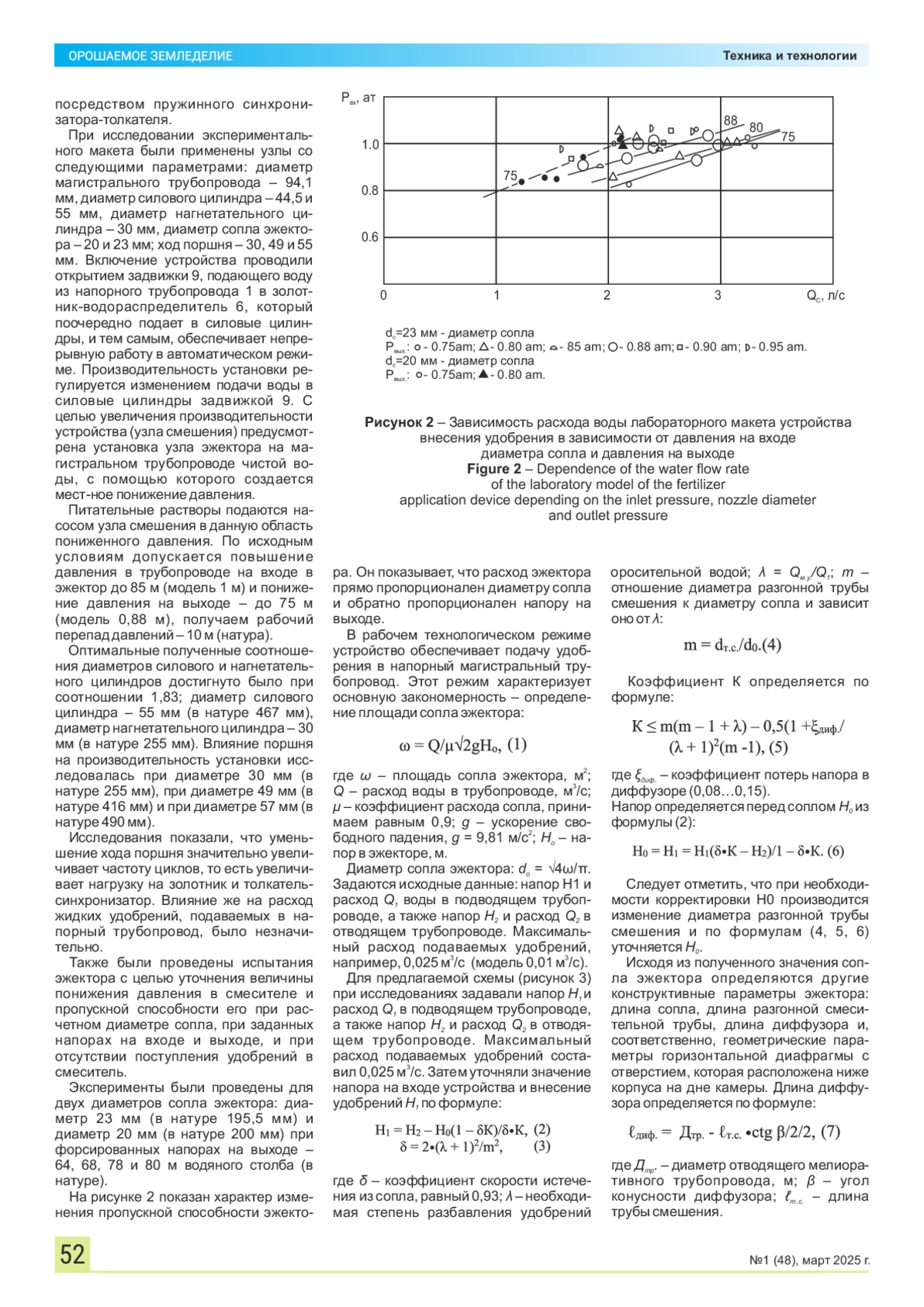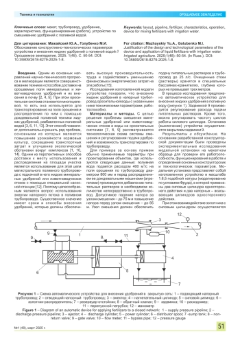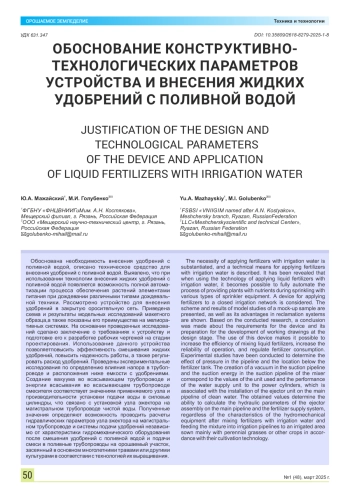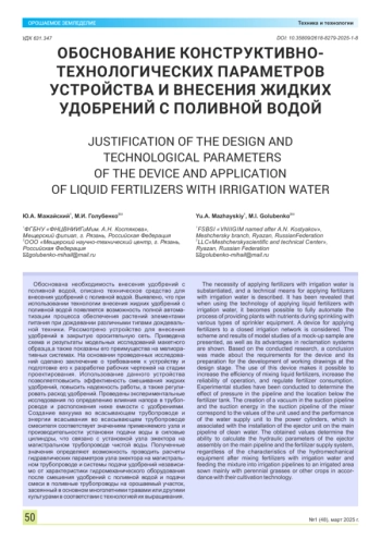Статья: ОБОСНОВАНИЕ КОНСТРУКТИВНОТЕХНОЛОГИЧЕСКИХ ПАРАМЕТРОВ УСТРОЙСТВА И ВНЕСЕНИЯ ЖИДКИХ УДОБРЕНИЙ С ПОЛИВНОЙ ВОДОЙ (2025)