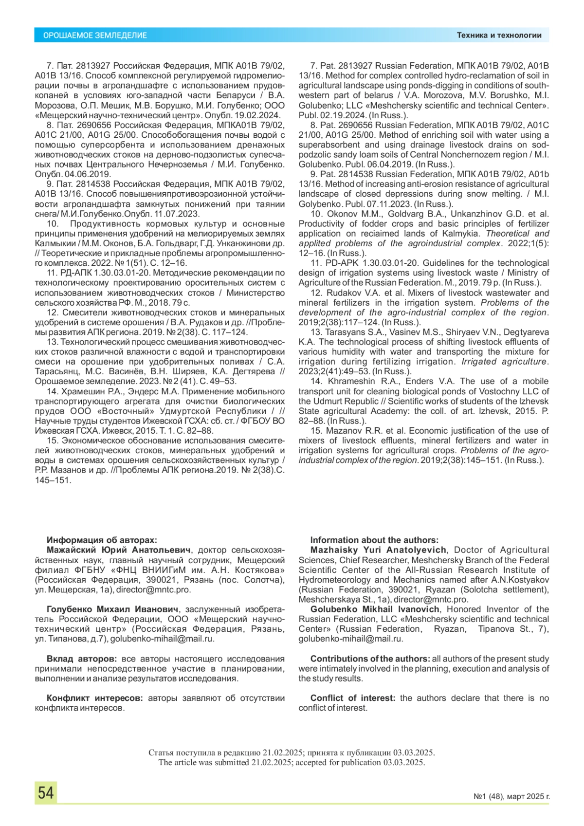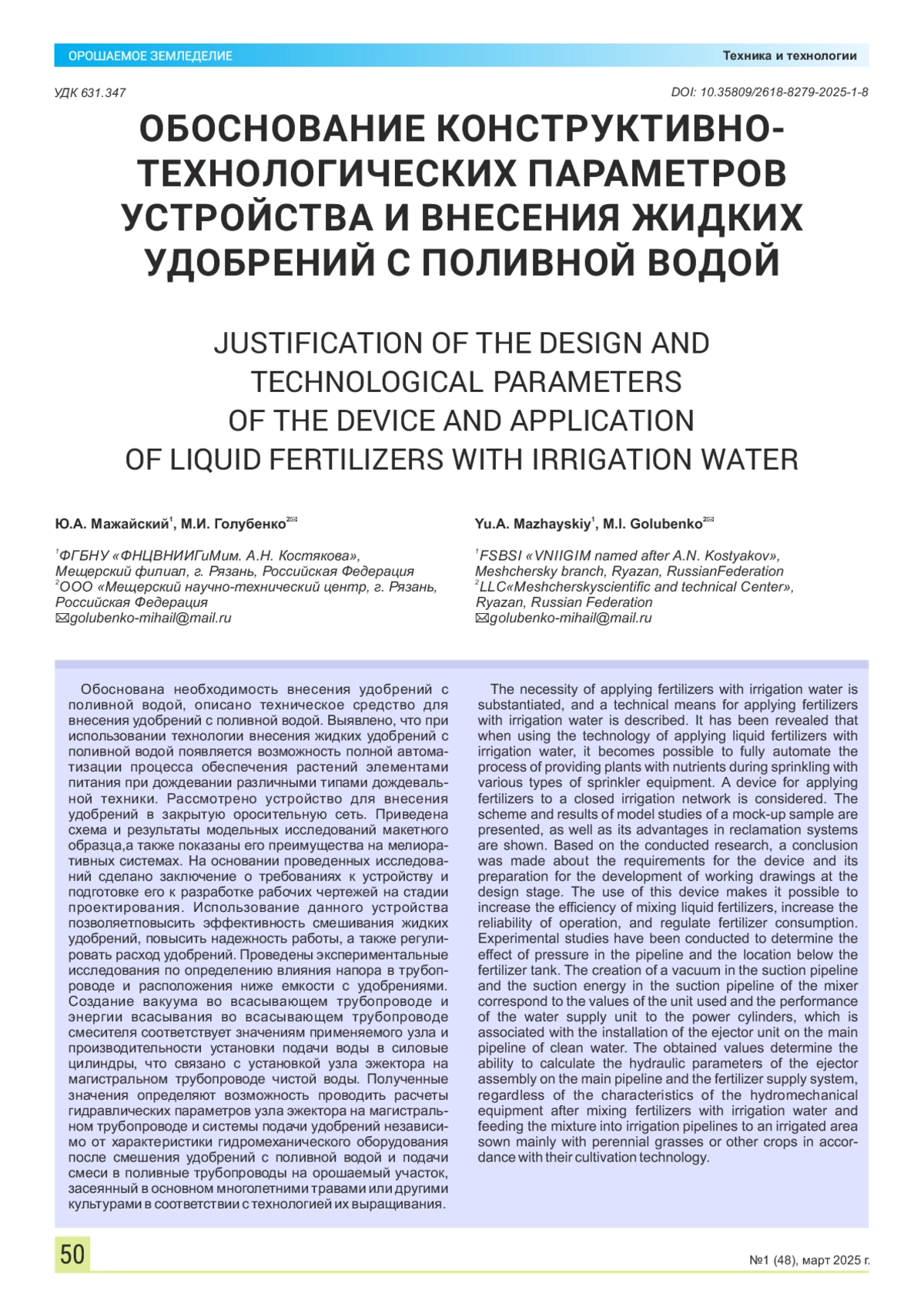 МАЖАЙСКИЙ Ю. А., ГОЛУБЕНКО М. И. ОБОСНОВАНИЕ КОНСТРУКТИВНОТЕХНОЛОГИЧЕСКИХ ПАРАМЕТРОВ УСТРОЙСТВА И ВНЕСЕНИЯ ЖИДКИХ УДОБРЕНИЙ С ПОЛИВНОЙ ВОДОЙ // ОРОШАЕМОЕ ЗЕМЛЕДЕЛИЕ. 2025. № 1 (48)