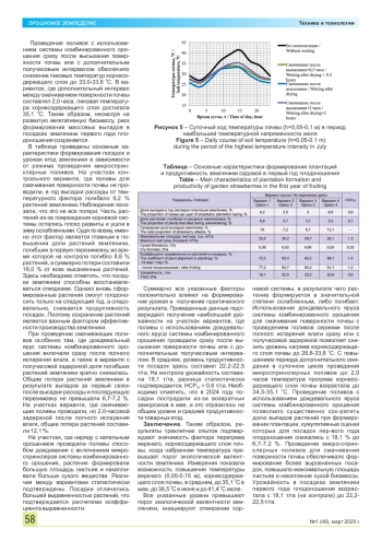 Актуальность исследований определяется необходимостью преодоления сдерживающего фактора развития промышленного производства земляники в Нижнем Поволжье, заключающегося в перегреве корнесодержащего слоя почвы в пиковые периоды температурной напряженности и интенсивного солнечного излучения, которые характерны для климата региона. Цель исследований сводилась к разработке технологии регулирования температурного фактора в посадках садовой земляники при возделывании ее в промышленной культуре с использованием систем комбинированного орошения. Рабочей гипотезой исследований является предположение, что использование дождевального яруса системы комбинированного орошения для смачивания поверхности почвы обеспечивает снижение уровня перегрева корнесодержащего слоя и компенсирует негативное действие фактора при закладке и эксплуатации плантаций земляники. Результаты трехлетних полевых исследований подтверждают значимость фактора перегрева верхнего, корнесодержащего слоя почвы, когда набранная температура превышает порог экологической валентности земляники (34,0 0С). Опыты показали возможность нагрева верхнего слоя почвы в пиковые по температурной напряженности периоды мая до 35,1 0С, июня – до 38,5 0С и июля – до 41,4 0С. Проведение поливов с использованием дождевального яруса системы комбинированного орошения для смачивания приповерхностного (0,02 м) слоя почвы, сериями, после полного испарения влаги или с получасовой задержкой, снижает пиковую температуру корнесодержащего слоя до 28,8-33,8 0С. В результате статистически значимо сокращается доля выпадов растений земляники, кумулятивные оценки которых для посадок первого года плодоношения снижались с 18,1 % до 6,7-7,2 %. Урожайность в посадках земляники первого года плодоношения возрастала с 18,1 т/га (на контроле) до 22,2- 22,5 т/га.