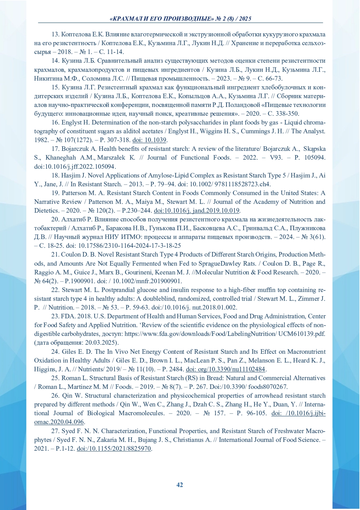 27. Syed F. N. N. Characterization, Functional Properties, and Resistant Starch of Freshwater Macrophytes / Syed F. N. N., Zakaria M. H., Bujang J. S., Christianus A. // International Journal of Food Science. - 2021. - Р.1-12. /. DOI: 10.1155/2021/8825970