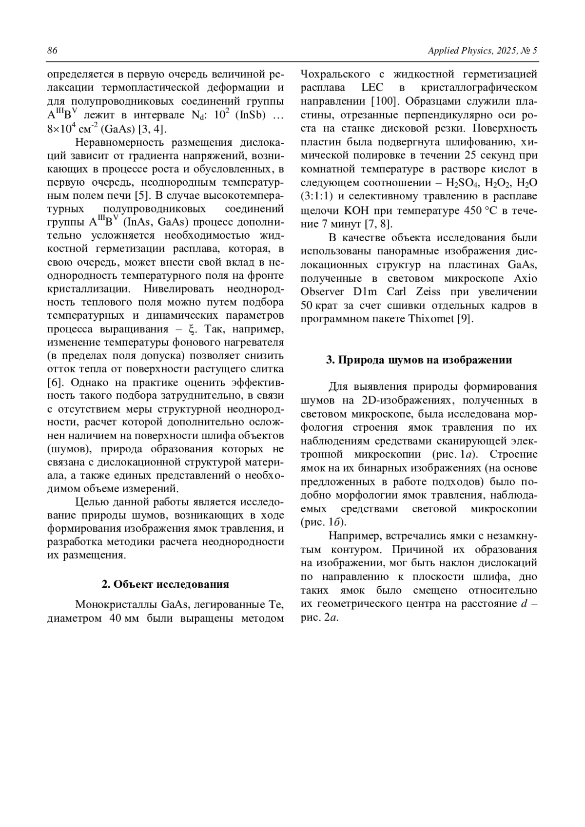 Однородность свойств полупроводниковых монокристаллов является одним из главных трендом развития отросли в последнее время. Однако на данный момент не существует единого представления о мере неоднородности свойств и методах ее оценки. Предложен метод анализа неоднородности размещения дислокационных ямок травления на основе решения задачи о близости объектов бинарного изображения разбиением пространства на полиэдры Вороного. Фильтрацию объектов по размерам проводили с учетом известной природы объектов измерения. На основе гистограммы распределения площадей темных объектов был рассчитан «статистический» порог фильтрации, величина которого составила 585 мкм2. Уточнение природы шумов на изображении проводилось на основе прямого наблюдения ямок травления методами сканирующей электронной микроскопии, что позволило оценить величину «физического» порога фильтрации – 16 мкм2. Установлено, что группам темных объектов, выделяемых «статистической» и «физической» фильтрацией, в координатах «площадь объекта S – его периметр P» отвечали различные значения тангенсов углов наклона аппроксимирующих кривых: 0,33 и 0,85 соответственно. Показано, что для получения объективных результатов при цифровой обработке изображений необходимо накопление представительной статистики измерений. Так, для исследуемого в работе панорамного изображения ямок травления в GaAs размер площади измерений должен быть не менее 0,42 мм2.