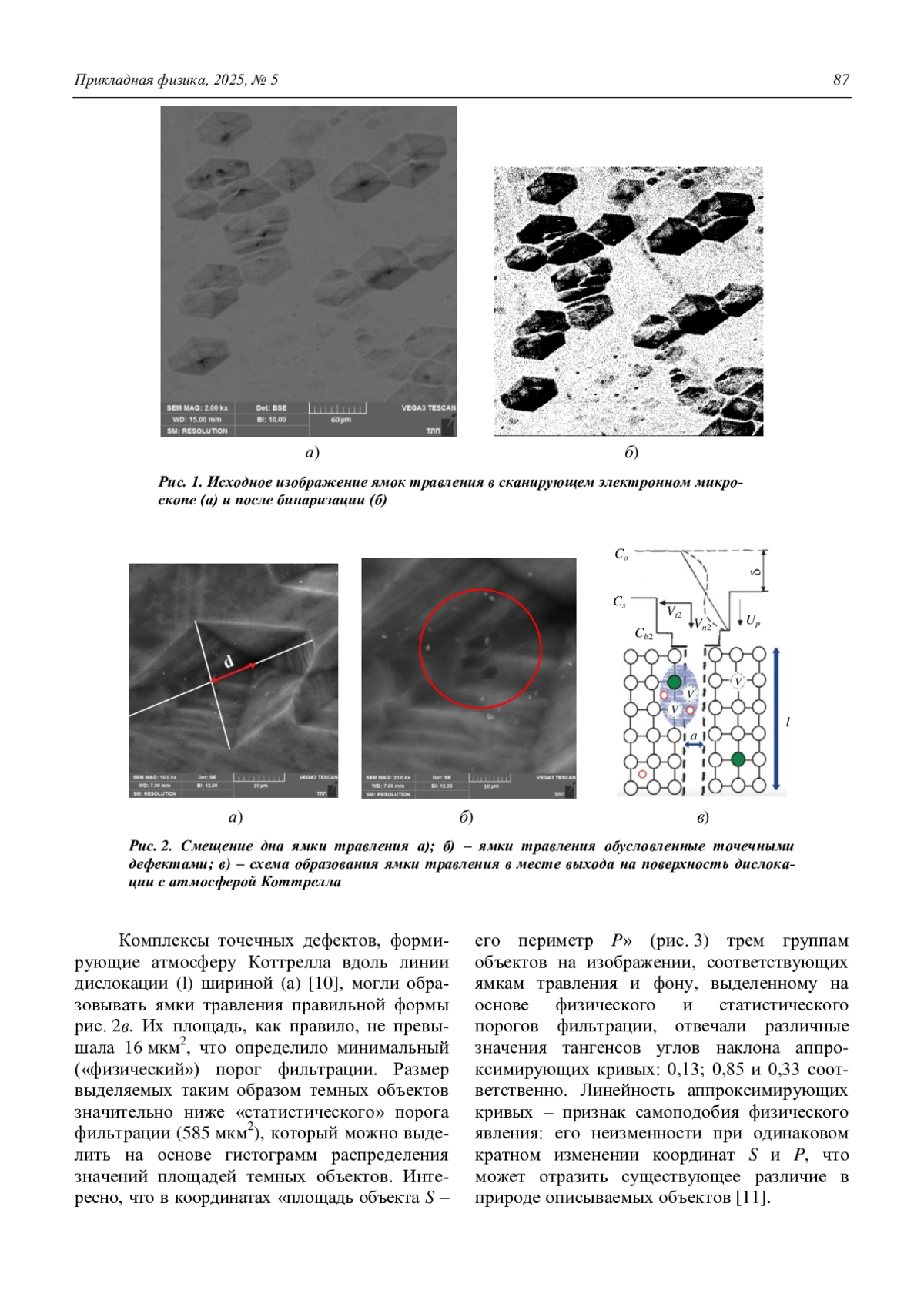 На основе статистики распределения площадей темных объектов для исследуемого в работе панорамного изображения определен порог фильтрации шумов – 585 мкм2. Показано, что группам темных объектов, выделяемых «статистической» (на основе гистограмм распределения значений площадей) и «физической» (по прямым наблюдениям морфологии ямок травления в сканирующем электронном микроскопе) фильтрацией, в координатах «площадь объекта S – его периметр P», отвечали различные значения тангенсов углов наклона аппроксимирующих кривых: 0,33 и 0,85 соответственно.
