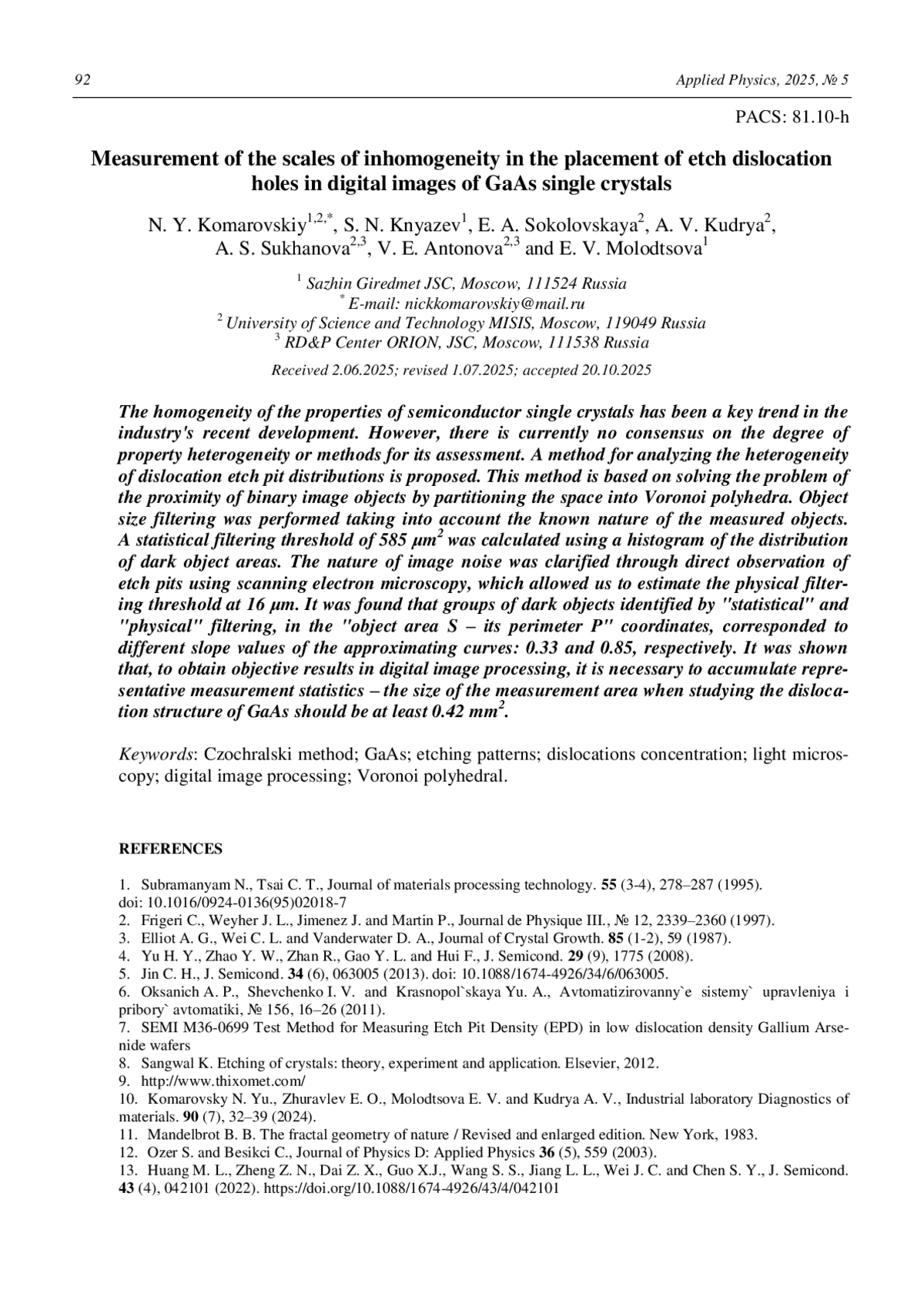 - Komarovsky N. Yu., Zhuravlev E. O., Mo-lodtsova E. V., Kudrya A. V. / Industrial laboratory Diag-nostics of materials. 2024. Vol. 90 (7). P. 32–39.