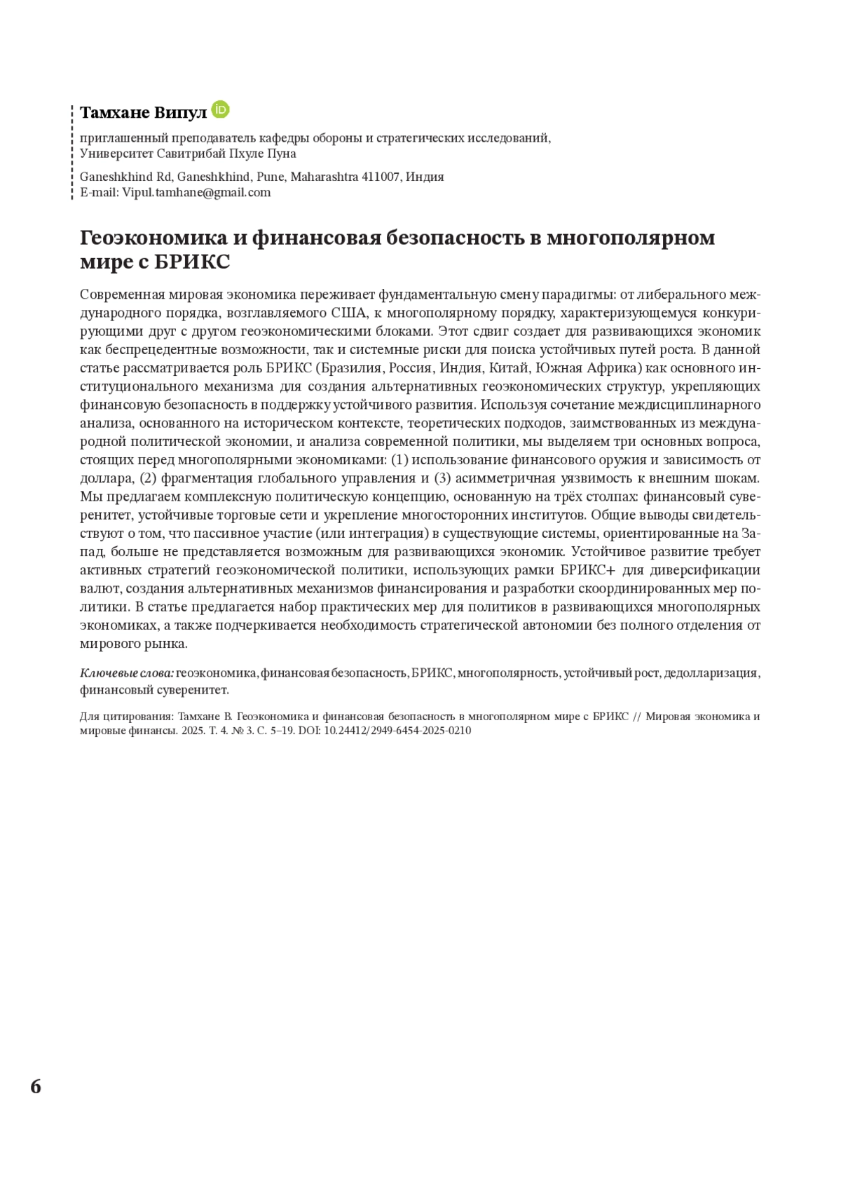 Современная мировая экономика переживает фундаментальную смену парадигмы: от либерального международного порядка, возглавляемого США, к многополярному порядку, характеризующемуся конкурирующими друг с другом геоэкономическими блоками. Этот сдвиг создает для развивающихся экономик как беспрецедентные возможности, так и системные риски для поиска устойчивых путей роста. В данной статье рассматривается роль БРИКС (Бразилия, Россия, Индия, Китай, Южная Африка) как основного институционального механизма для создания альтернативных геоэкономических структур, укрепляющих финансовую безопасность в поддержку устойчивого развития. Используя сочетание междисциплинарного анализа, основанного на историческом контексте, теоретических подходов, заимствованных из международной политической экономии, и анализа современной политики, мы выделяем три основных вопроса, стоящих перед многополярными экономиками: (1) использование финансового оружия и зависимость от доллара, (2) фрагментация глобального управления и (3) асимметричная уязвимость к внешним шокам. Мы предлагаем комплексную политическую концепцию, основанную на трёх столпах: финансовый суверенитет, устойчивые торговые сети и укрепление многосторонних институтов. Общие выводы свидетельствуют о том, что пассивное участие (или интеграция) в существующие системы, ориентированные на Запад, больше не представляется возможным для развивающихся экономик. Устойчивое развитие требует активных стратегий геоэкономической политики, использующих рамки БРИКС+ для диверсификации валют, создания альтернативных механизмов финансирования и разработки скоординированных мер политики. В статье предлагается набор практических мер для политиков в развивающихся многополярных экономиках, а также подчеркивается необходимость стратегической автономии без полного отделения от мирового рынка.