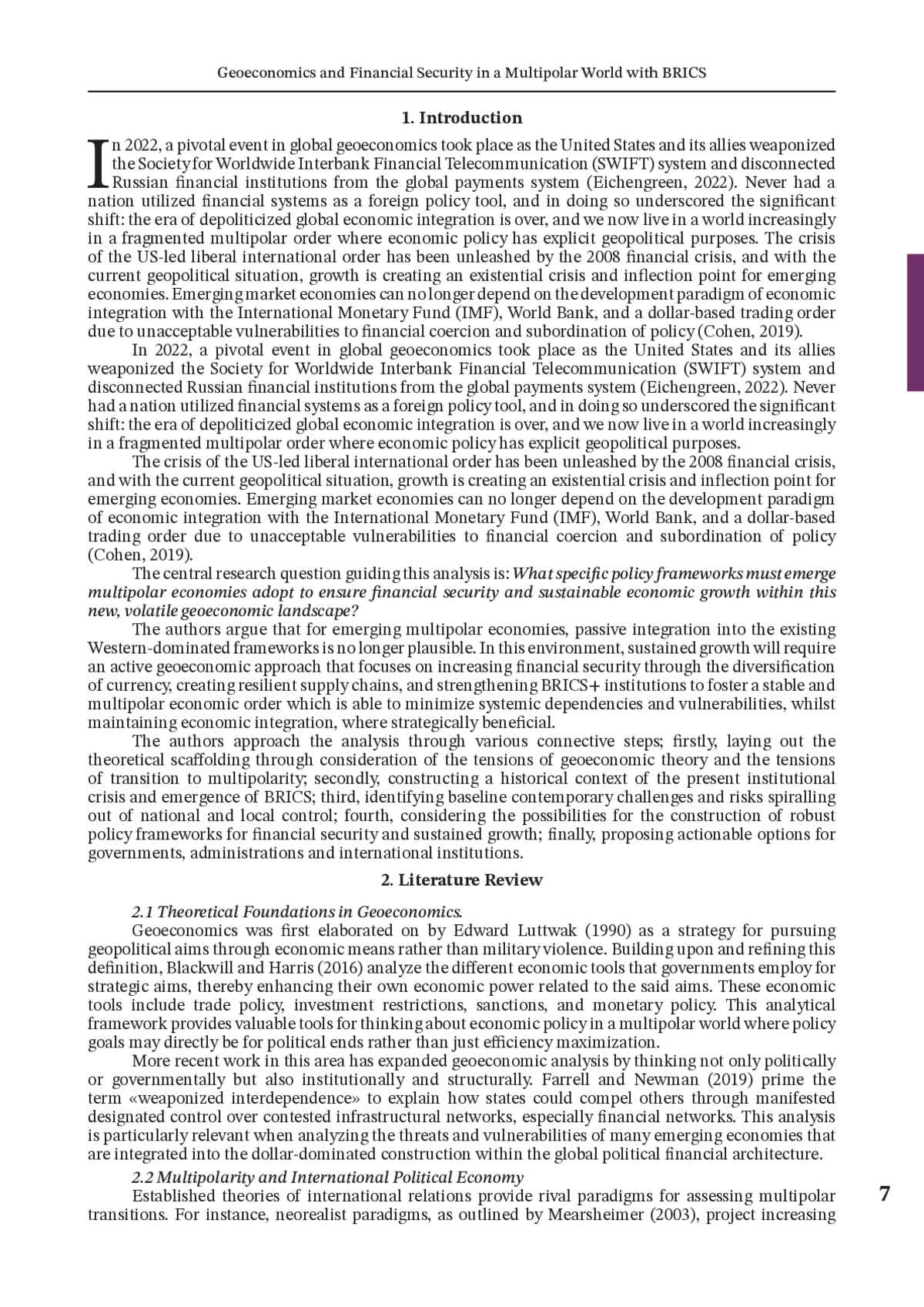 В 2022 году произошло ключевое событие в мировой геоэкономике: США и их союзники превратили в оружие систему межбанковских финансовых телекоммуникаций (SWIFT) и отключили российские финансовые учреждения от глобальной платёжной системы (Айхенгрин, 2022). Никогда ещё ни одна страна не использовала финансовые системы в качестве инструмента внешней политики. Тем самым она подчеркнула значительный сдвиг: эпоха деполитизированной глобальной экономической интеграции закончилась, и теперь мы живём в мире, который становится всё более фрагментированным, в многополярном порядке, где экономическая политика преследует явные геополитические цели. Кризис либерального международного порядка, возглавляемого США, был спровоцирован финансовым кризисом 2008 года, а в нынешней геополитической ситуации экономический рост создаёт экзистенциальный кризис и переломный момент для развивающихся экономик. Страны с развивающейся экономикой больше не могут полагаться на парадигму развития, основанную на экономической интеграции с Международным валютным фондом (МВФ), Всемирным банком и торговым порядком, основанным на долларе. Это связано с неприемлемой уязвимостью перед финансовым принуждением и подчинением политики (Cohen, 2019).