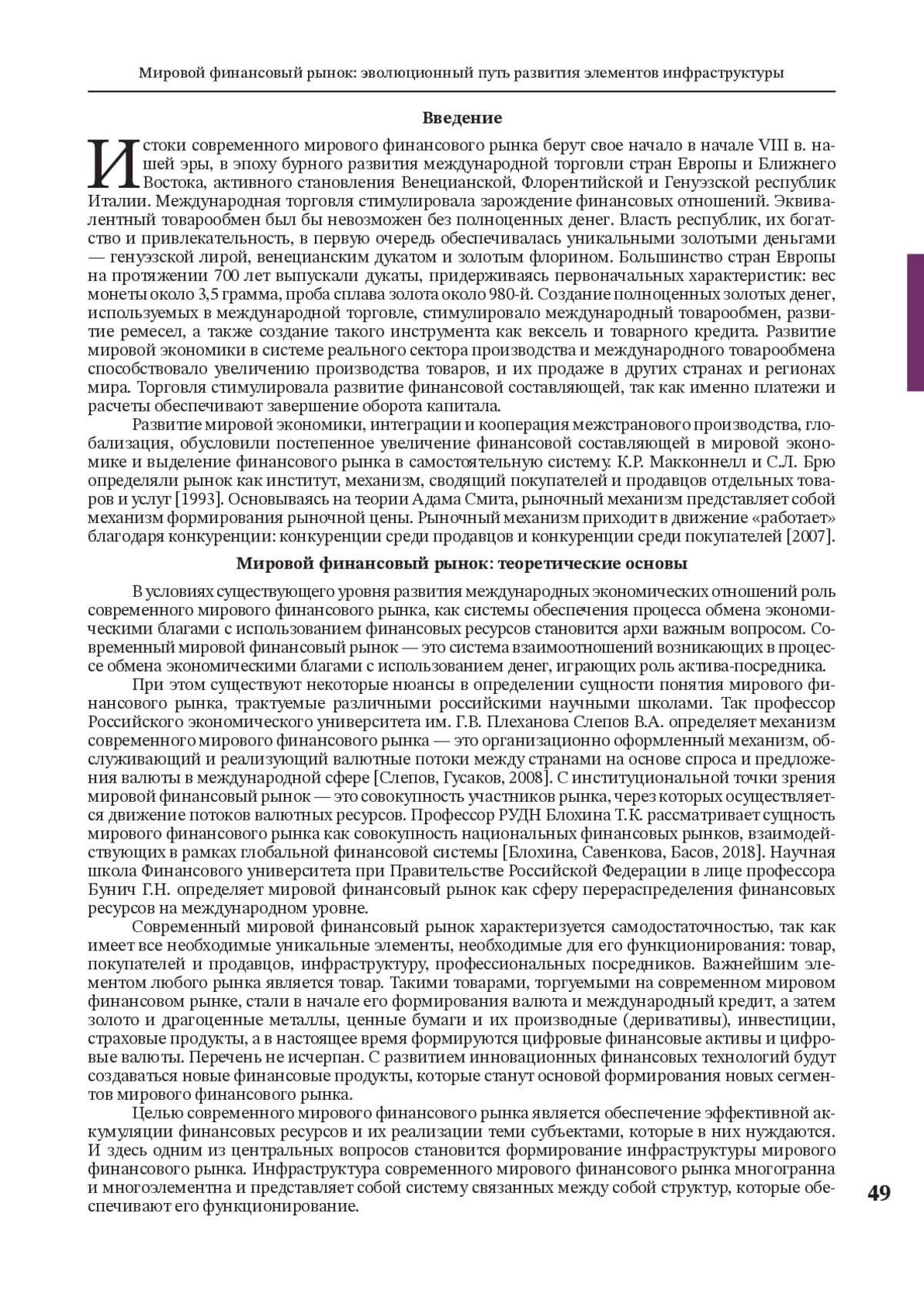 Современный мировой финансовый рынок прошел достаточно длинный и противоречивый эволюционный путь развития, беря свое начало в VIII в. Развитие мирового хозяйства, кооперационного взаимодействия, межстранового производства привело к увеличению финансовой составляющей в мировой экономике и как следствие выделения финансового рынка в отдельную значимую систему международных отношений. Современная концептуальная основа международного финансового рынка имеет достаточно структурированную и методологически обоснованную конструкцию, реализующую современный уровень развития международных экономических отношений. В статье рассмотрена инфраструктура мирового финансового рынка в разрезе институциональных, правовых, платежно-расчетных, коммуникационных и информационных элементов. Каждый элемент инфраструктуры международного финансового рынка представлен как система институтов, обеспечивающих достижение эффективного функционирования мировой финансовой системы в целом. В частности, институциональная инфраструктура современного мирового финансового рынка рассматривается как система международных и региональных финансовых институтов, а платежно-расчетная инфраструктура через призму взаимосвязанных элементов, которые обеспечивают движение валютных ценностей на международном уровне в системе внешнеэкономической, международной кредитной и инвестиционной деятельности. Отмечено, что на современном этапе развития финансовых технологий появились цифровые финансовые инструменты, формирующие инновационные новые сегменты финансового рынка. В статье также приведен анализ развития мирового кредитного рынка и роль международного кредита в современной мировой экономике. Особое место в статье уделено значению фондового рынка и его влиянию на систему перераспределения инвестиционных ресурсов.