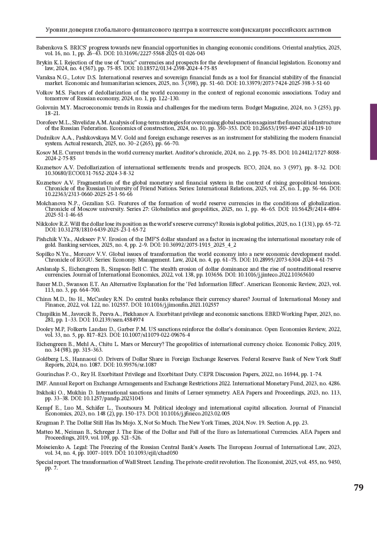 13. Кузнецов А.В. Фрагментация мировой валютно-финансовой системы в условиях роста геополитической напряженности // Вестник Российского университета дружбы народов. Серия: Международные отношения. 2025. Т. 25. № 1. С. 56-66. DOI: 10.22363/2313-0660-2025-25-1-56-66