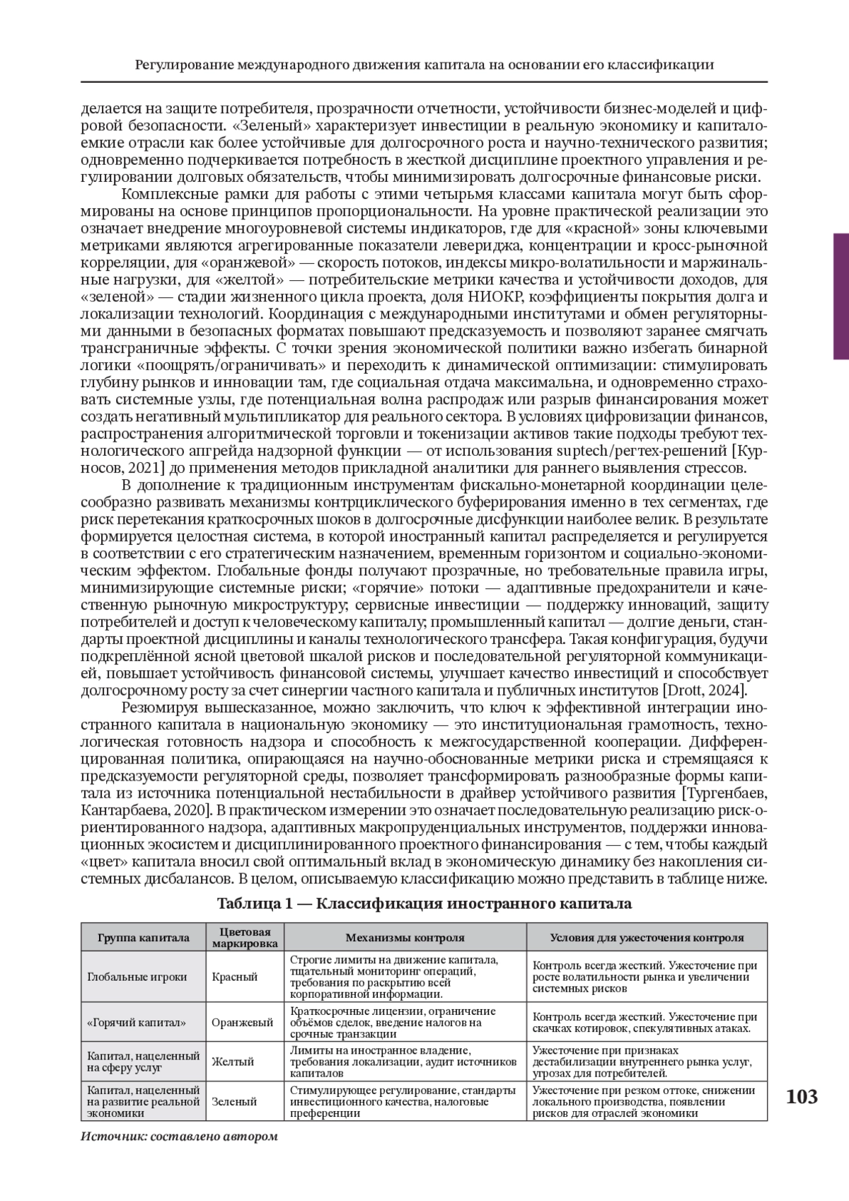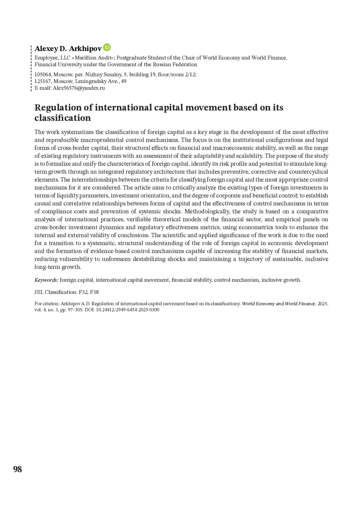 В работе систематизируется классификация иностранного капитала как ключевого этапа в разработке наиболее результативных и воспроизводимых механизмов макропруденциального контроля. В фокусе внимания находятся институциональные конфигурации и правовые формы трансграничного капитала, их структурные эффекты на финансовую и макроэкономическую устойчивость, а также спектр действующих регуляторных инструментов с оценкой их адаптивности и масштабируемости. Цель исследования заключается в формализации и унификации признаков иностранного капитала, идентификации его риск-профиля и потенциала для стимулирования долгосрочного роста через интегрированную регуляторную архитектуру, включающую профилактические, корректирующие и контрциклические элементы. Рассмотрены взаимосвязи между критериями классификации иностранного капитала и наиболее подходящих механизмов контроля за ним. Статья ставит своей задачей критический анализ существующих типов иностранных инвестиций по параметрам ликвидности, направленности инвестиций и степени корпоративного и бенефициарного контроля; установление причинно-следственных и корреляционных связей между формами капитала и результативностью контрольных механизмов в разрезе издержек комплаенса и предотвращения системных шоков. Методологически исследование опирается на сравнительный анализ международных практик, верифицируемые теоретические модели финансового сектора и эмпирические панели по динамике трансграничных вложений и метрикам регуляторной эффективности, с применением инструментов эконометрики для повышения внутренней и внешней валидности выводов. Научная и прикладная значимость работы обусловлена потребностью в переходе к системному, структурному пониманию роли иностранного капитала в экономическом развитии и в формировании доказательно обоснованных механизмов контроля, способных повышать устойчивость финансовых рынков, снижать уязвимость к непредвиденным дестабилизирующим шокам и поддерживать траекторию устойчивого, инклюзивного долгосрочного роста.