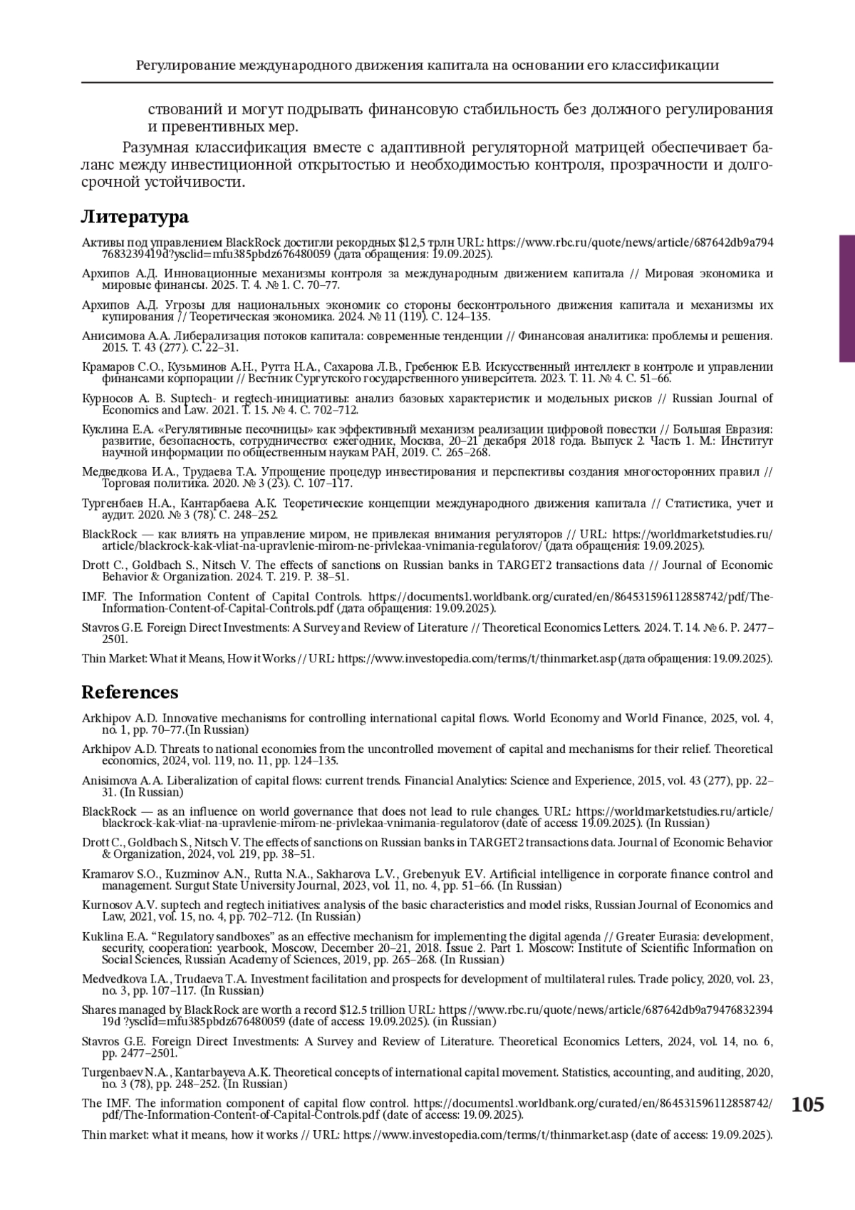 2. Архипов А.Д. Инновационные механизмы контроля за международным движением капитала // Мировая экономика и мировые финансы. 2025. Т. 4. № 1. С. 70-77.
