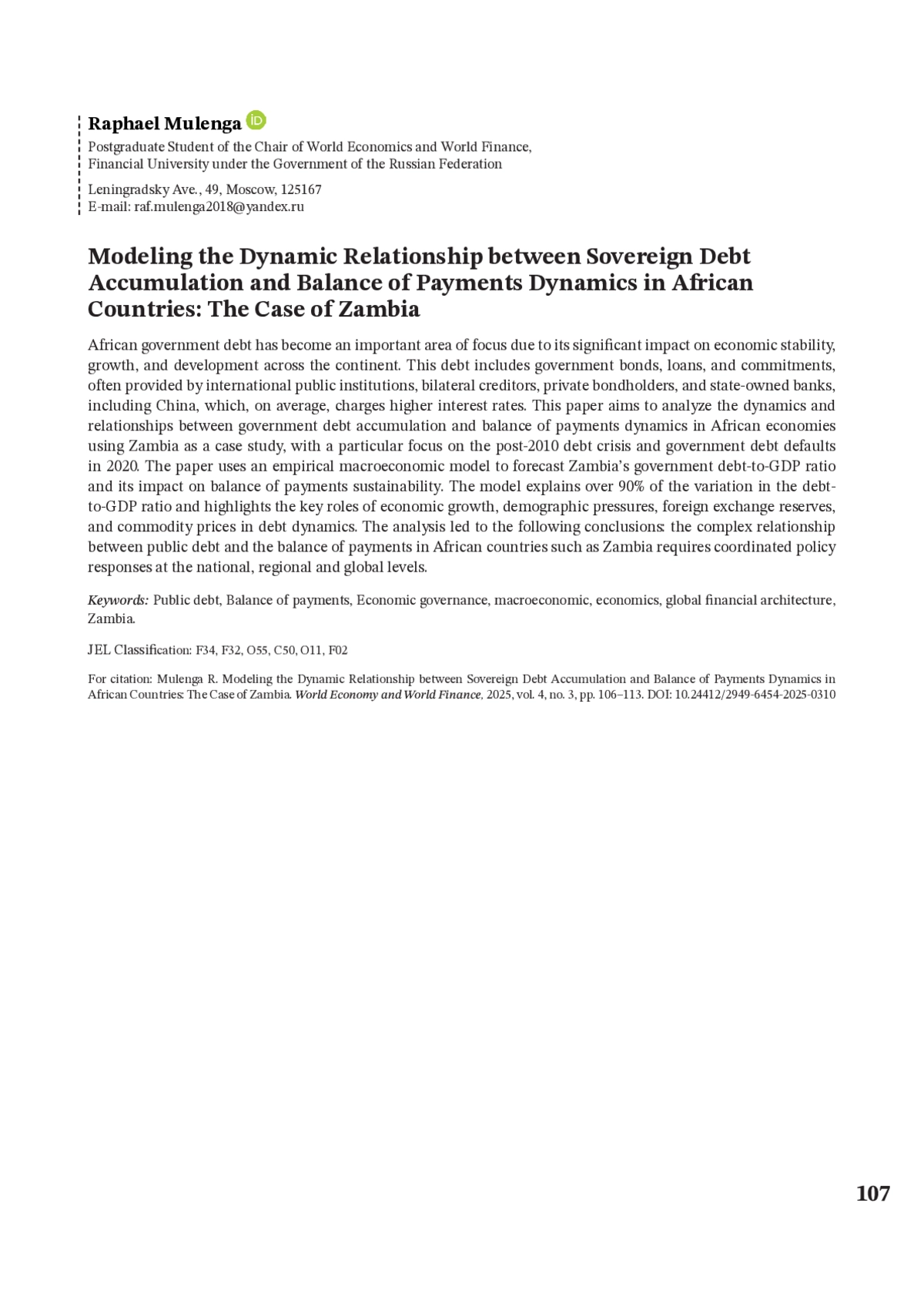 Государственный долг африканских стран стал важной областью внимания ввиду его существенного влияния на экономическую стабильность, рост и развитие на всем континенте. В состав этого долга входят государственный облигации, займы и обязательства, часто предоставляемые международными государственными институтами, двусторонними кредиторами, частными держателями облигаций и государственными банками, включая Китай, который в среднем устанавливает более высокие процентные ставки. Целью данной статьи является анализ динамических и взаимосвязей между накоплением государственного долга и динамикой платежного баланса в африканских экономиках на примере Замбии с особым акцентом на долговой кризис после 2010 г. и дефолты по государственному долгу в 2020 г. В работе используются такой метод исследования как: метод эмпирическая макроэкономическая модель для прогнозирования соотношения государственного долга Замбии к ВВП и его влияния на устойчивость платежного баланса. Модель объясняет более 90% изменений в соотношении долга к ВВП и подчеркивает ключевую роль экономического роста, демографического давления, валютных резервов и цен на сырьевые товары в динамике долга. Проведенный анализ позволил сформулировать следующие выводы: сложная взаимосвязь между государственным долгом и платежным балансом в африканских странах, таких как Замбия, требует скоординированных политических мер на национальном, региональном и глобальном уровнях.