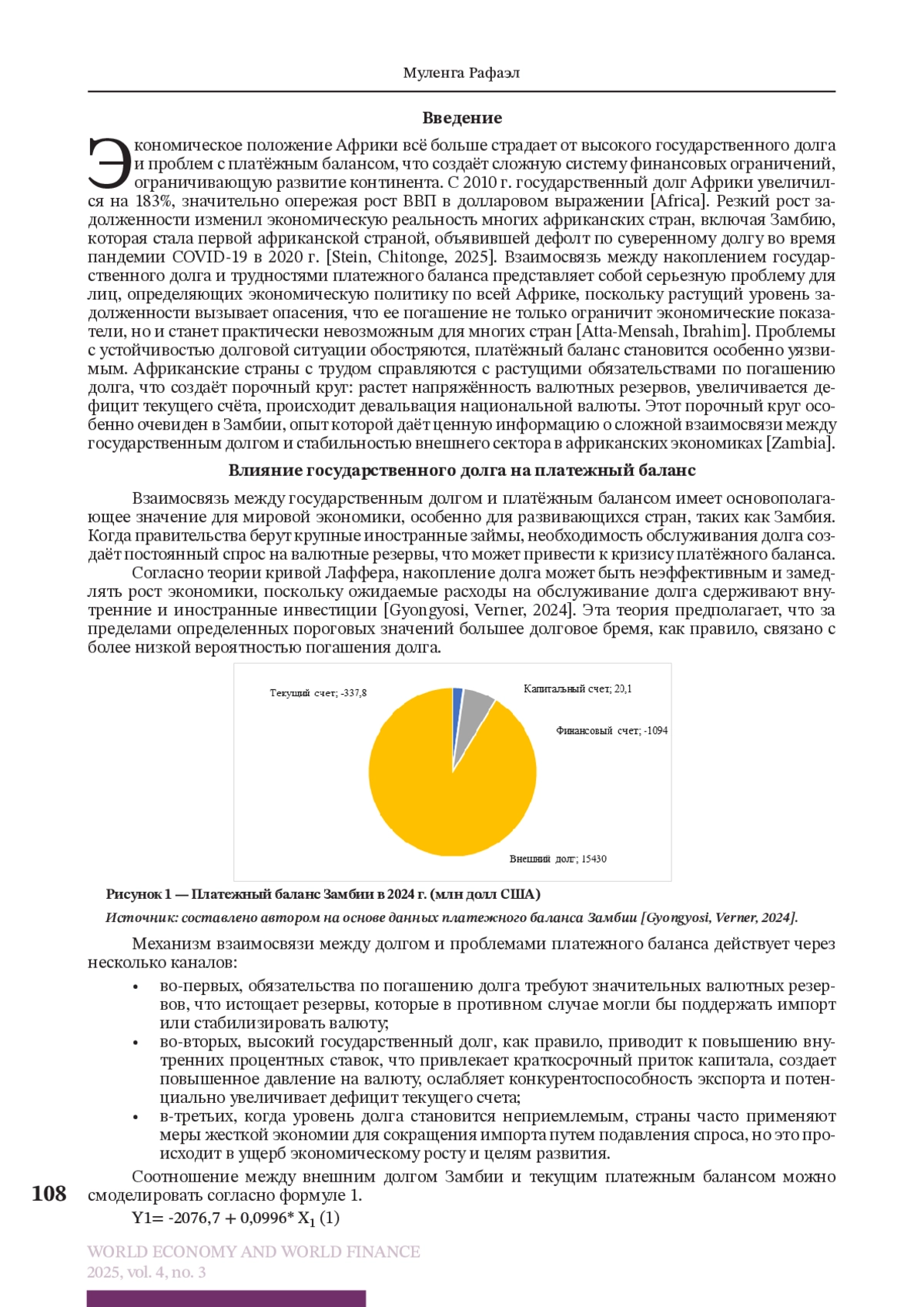 Экономическое положение Африки всё больше страдает от высокого государственного долга и проблем с платёжным балансом, что создаёт сложную систему финансовых ограничений, ограничивающую развитие континента. С 2010 г. государственный долг Африки увеличился на 183%, значительно опережая рост ВВП в долларовом выражении [Africa]. Резкий рост задолженности изменил экономическую реальность многих африканских стран, включая Замбию, которая стала первой африканской страной, объявившей дефолт по суверенному долгу во время пандемии COVID-19 в 2020 г. [Stein, Chitonge, 2025]. Взаимосвязь между накоплением государственного долга и трудностями платежного баланса представляет собой серьезную проблему для лиц, определяющих экономическую политику по всей Африке, поскольку растущий уровень задолженности вызывает опасения, что ее погашение не только ограничит экономические показатели, но и станет практически невозможным для многих стран [Atta-Mensah, Ibrahim]. Проблемы с устойчивостью долговой ситуации обостряются, платёжный баланс становится особенно уязвимым. Африканские страны с трудом справляются с растущими обязательствами по погашению долга, что создаёт порочный круг: растет напряжённость валютных резервов, увеличивается дефицит текущего счёта, происходит девальвация национальной валюты. Этот порочный круг особенно очевиден в Замбии, опыт которой даёт ценную информацию о сложной взаимосвязи между государственным долгом и стабильностью внешнего сектора в африканских экономиках [Zambia].