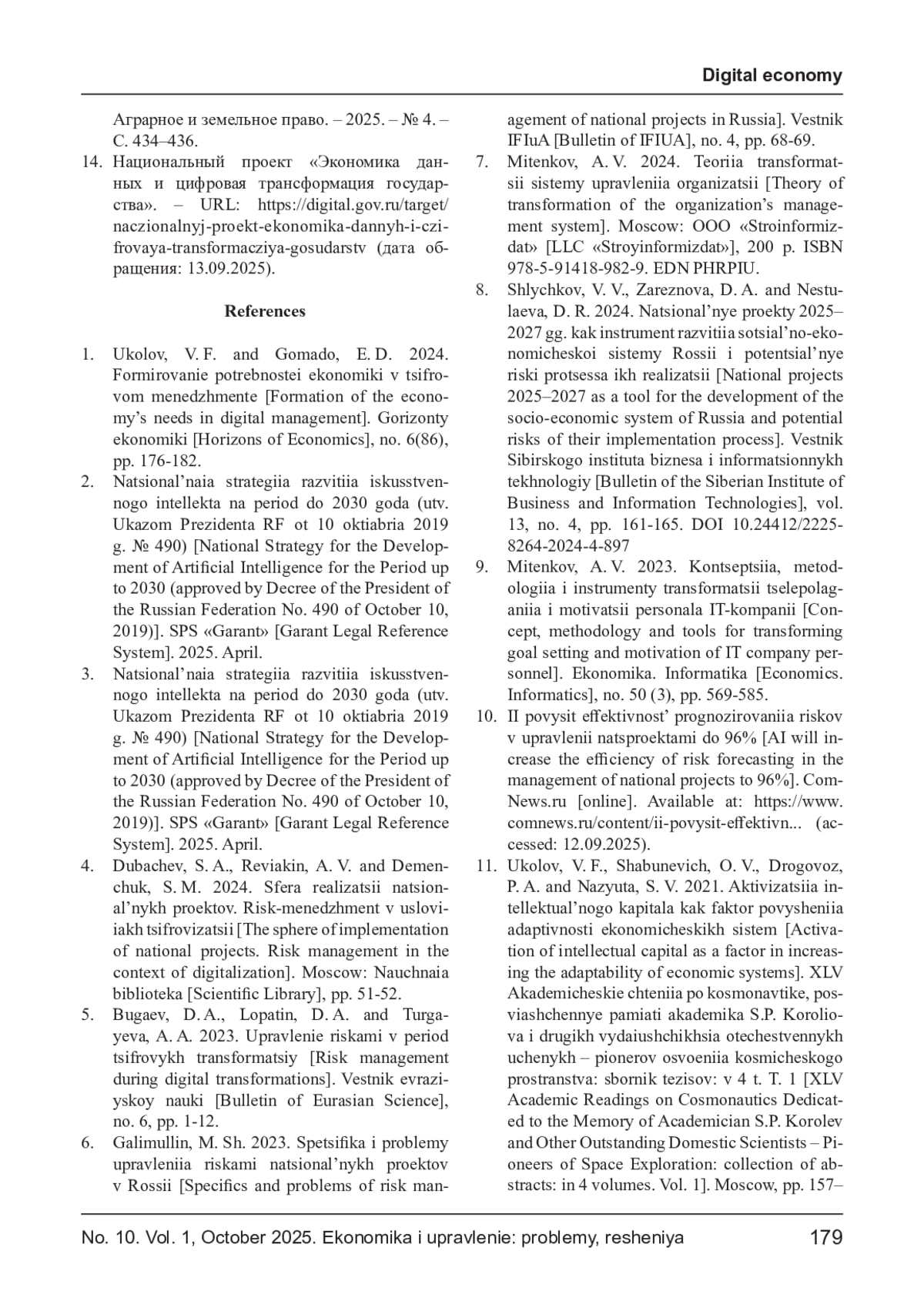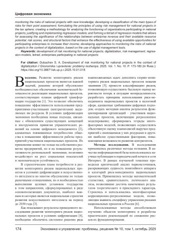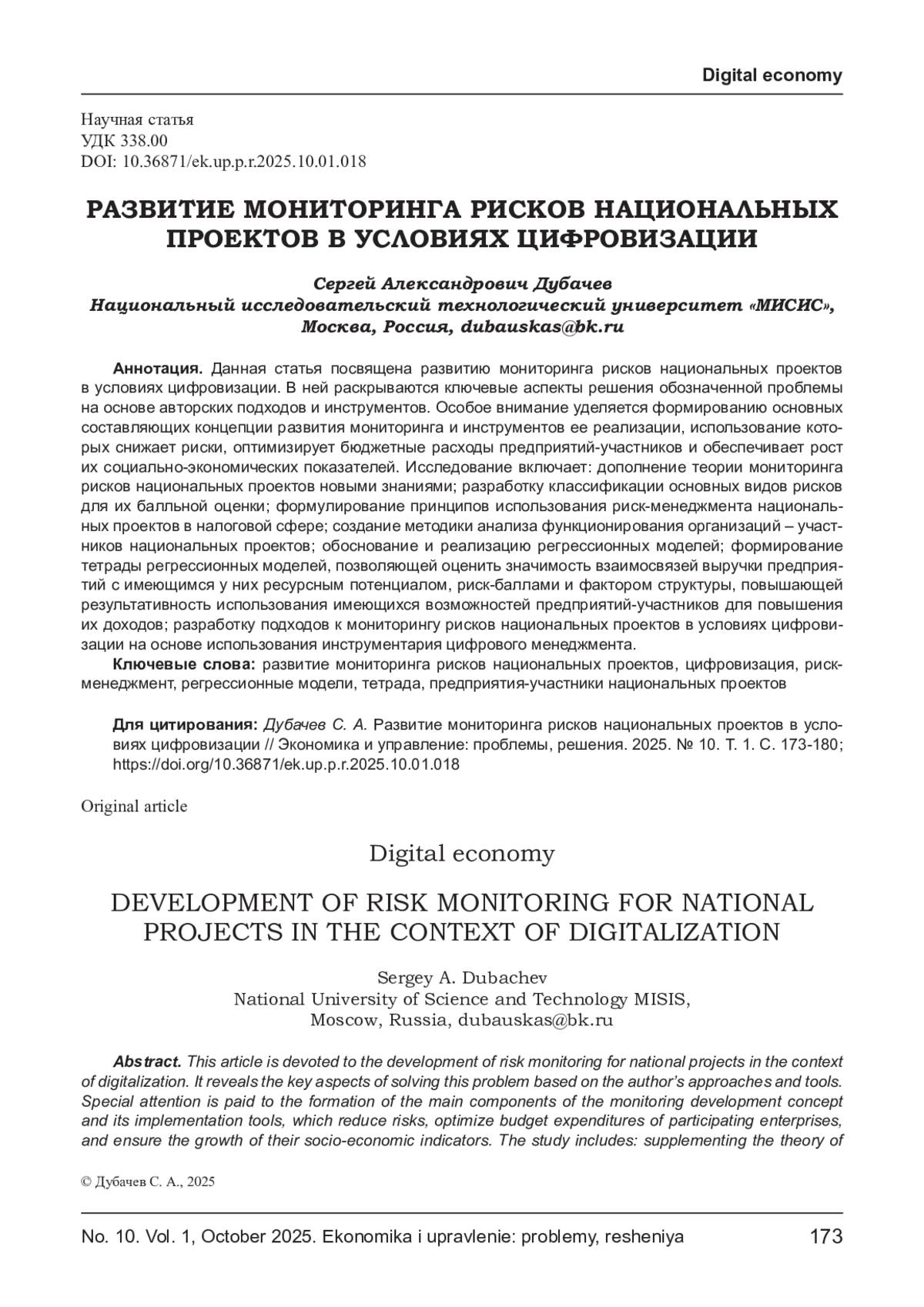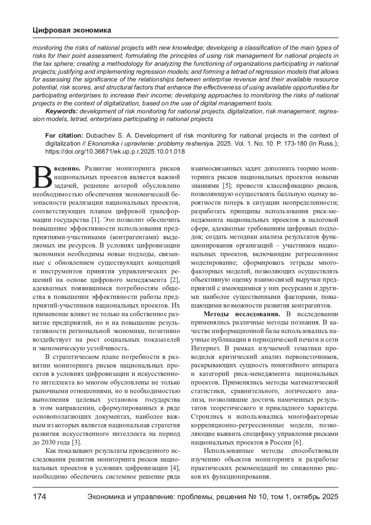 ДУБАЧЕВ С. А. РАЗВИТИЕ МОНИТОРИНГА РИСКОВ НАЦИОНАЛЬНЫХ ПРОЕКТОВ В УСЛОВИЯХ ЦИФРОВИЗАЦИИ // ЭКОНОМИКА И УПРАВЛЕНИЕ: ПРОБЛЕМЫ, РЕШЕНИЯ. 2025. ТОМ 1 № 10
