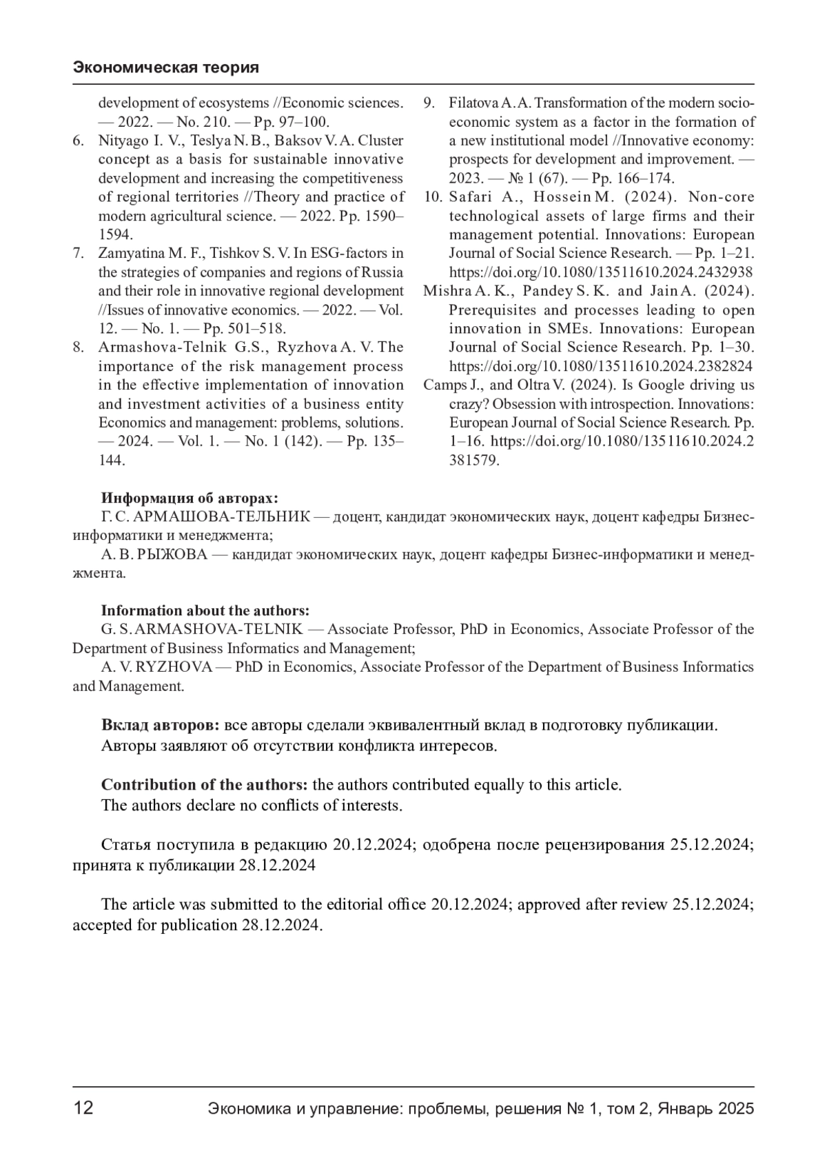 8. Армашова- Тельник Г. С., Рыжова А. В. Значимость процесса управления рисками в эффективной реализации инновационно- инвестиционной деятельности субъекта хозяйствования Экономика и управление: проблемы, решения. - 2024. - Т. 1. - № 1 (142). - С. 135-144. EDN: AOFCZG