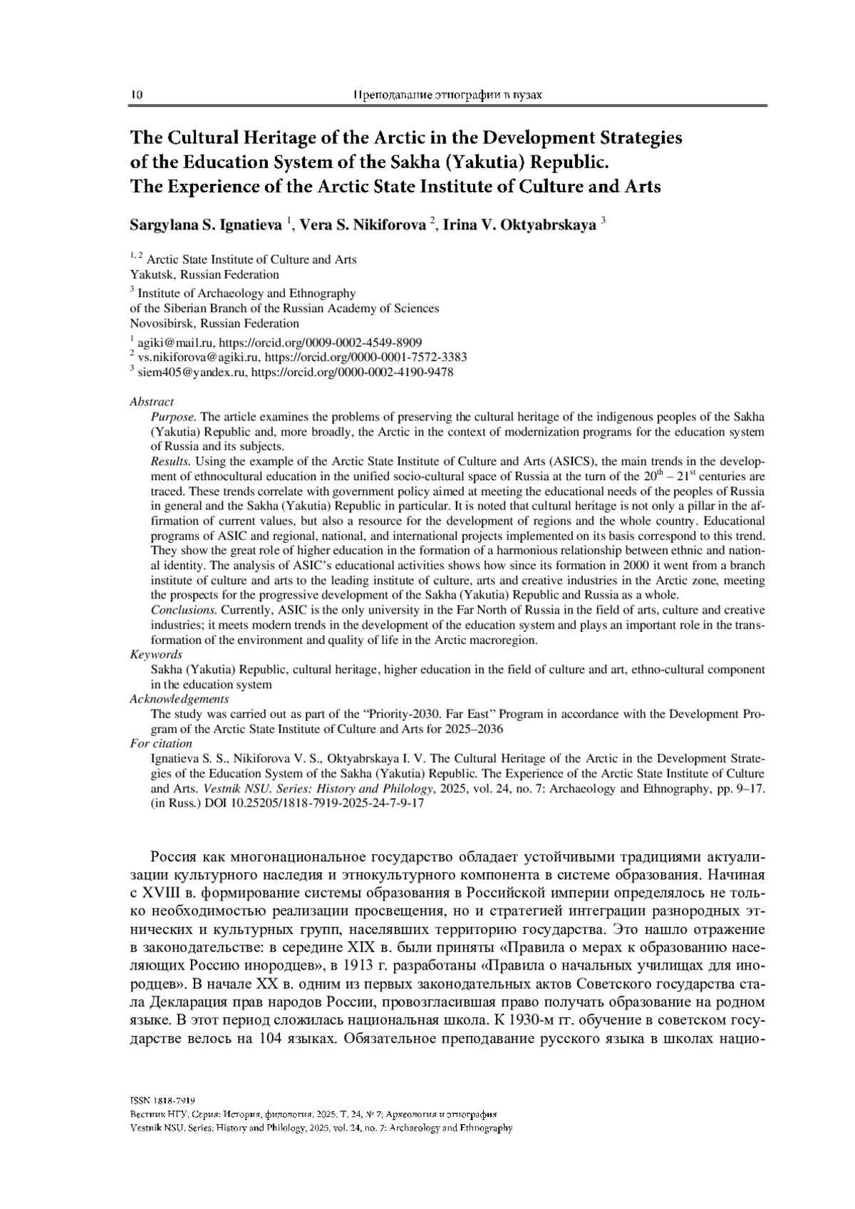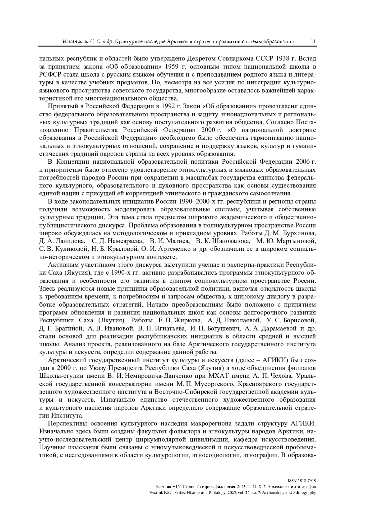 Рассмотрены проблемы сохранения культурного наследия коренных народов Республики Саха (Якутия) и Арктики в целом в контексте программ модернизации системы образования в России и ее субъектах. На примере Арктического государственного института культуры и искусств (АГИКИ) прослежены основные тенденции в развитии этнокультурного образования в едином социокультурном пространстве России рубежа ХХ–XXI вв. Показано, как с момента образования АГИКИ прошел путь от отраслевого института культуры и искусств до ведущего в арктической зоне института культуры, искусств и креативных индустрий, отвечающего перспективам поступательного развития Республики Саха (Якутия) и России в целом.