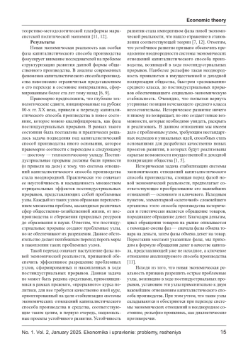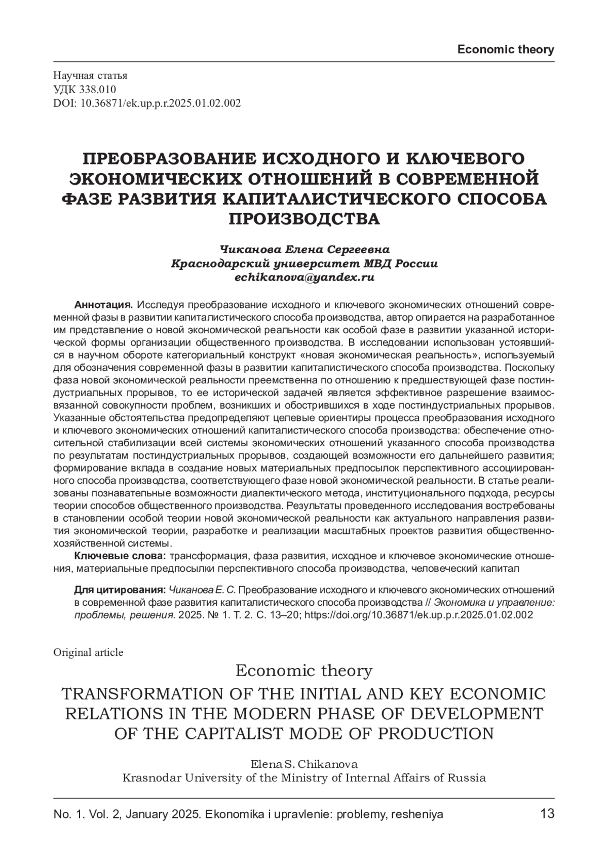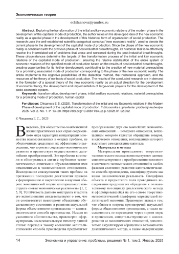 Исследуя преобразование исходного и ключевого экономических отношений современной фазы в развитии капиталистического способа производства, автор опирается на разработанное им представление о новой экономической реальности как особой фазе в развитии указанной исторической формы организации общественного производства. В исследовании использован устоявшийся в научном обороте категориальный конструкт «новая экономическая реальность», используемый для обозначения современной фазы в развитии капиталистического способа производства. Поскольку фаза новой экономической реальности преемственна по отношению к предшествующей фазе постиндустриальных прорывов, то ее исторической задачей является эффективное разрешение взаимосвязанной совокупности проблем, возникших и обострившихся в ходе постиндустриальных прорывов. Указанные обстоятельства предопределяют целевые ориентиры процесса преобразования исходного и ключевого экономических отношений капиталистического способа производства: обеспечение относительной стабилизации всей системы экономических отношений указанного способа производства по результатам постиндустриальных прорывов, создающей возможности его дальнейшего развития; формирование вклада в создание новых материальных предпосылок перспективного ассоциированного способа производства, соответствующего фазе новой экономической реальности. В статье реализованы познавательные возможности диалектического метода, институционального подхода, ресурсы теории способов общественного производства. Результаты проведенного исследования востребованы в становлении особой теории новой экономической реальности как актуального направления развития экономической теории, разработке и реализации масштабных проектов развития общественно- хозяйственной системы.