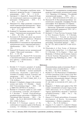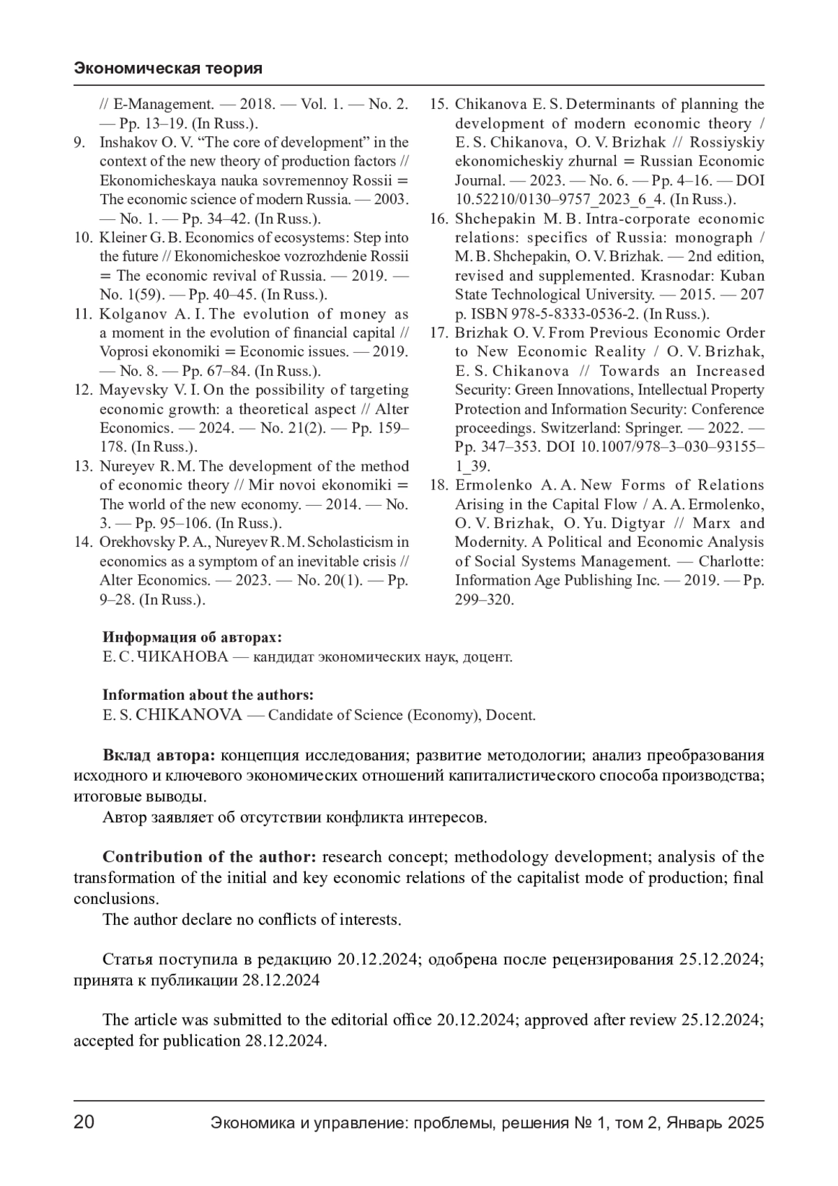15. Чиканова Е. С. детерминанты планирования развития современной экономической теории / Е. С. Чиканова, О. В. Брижак // Российский экономический журнал. - 2023. - № 6. - С. 4-16. DOI: 10.52210/0130-9757_2023_6_4
