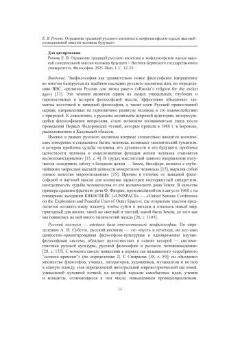 Экофилософия как сравнительно новое философское направление во многом базируется на идейном наследии русского космизма или, по определению BBC, «религии России для эпохи ракет» («Russiaʼs religion for the rocket age») [31]. Это течение является одним из самых уникальных, глубоких и перспективных в истории философской мысли, эффективно объединяет эле - менты восточной и западной философии, а также идеи Русской православной церкви, направленные на гармоничное развитие человека в его взаимодействии с природой. К сожалению, с русским космизмом широкой аудитории, интересующейся философскими вопросами, стало возможно познакомиться лишь после проведения Первых Федоровских чтений, которые прошли в 1988 г. в Боровске, расположенном в Калужской области.