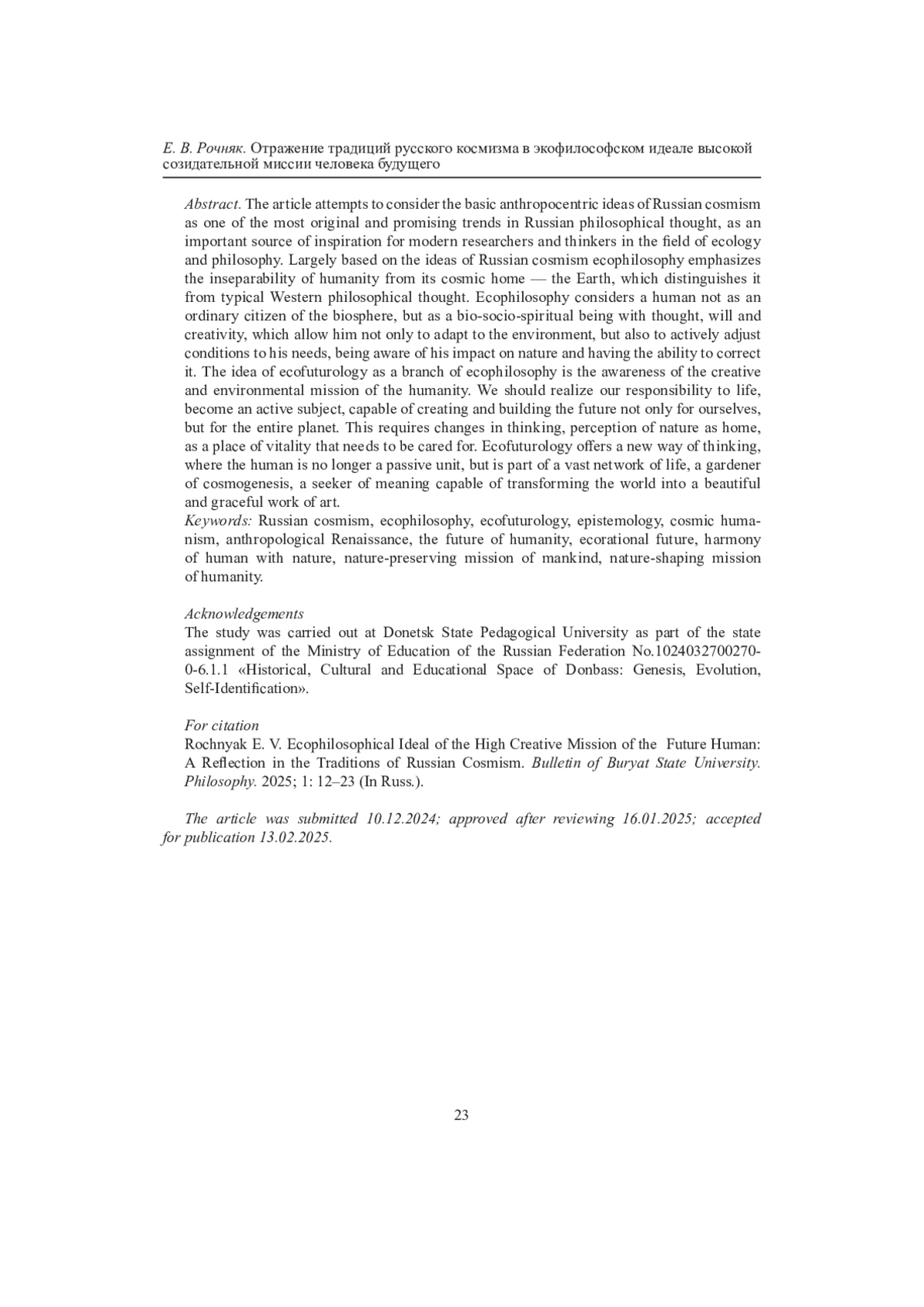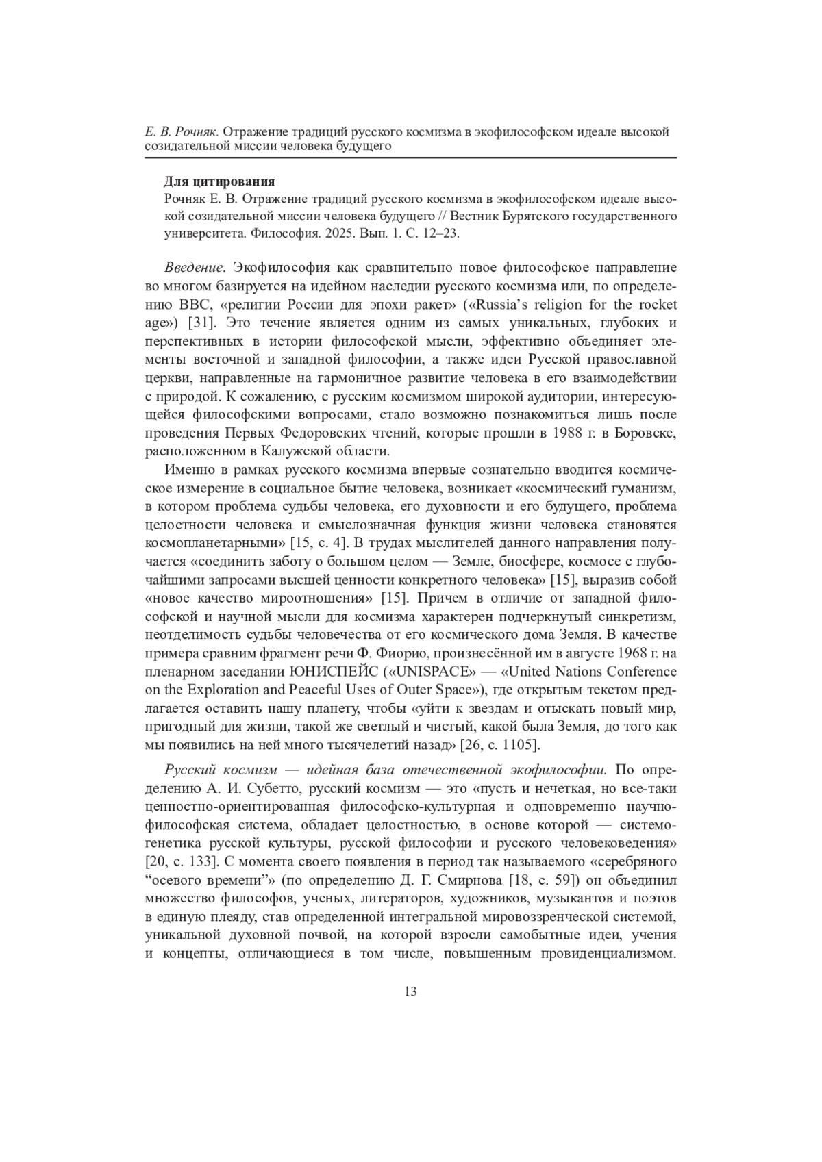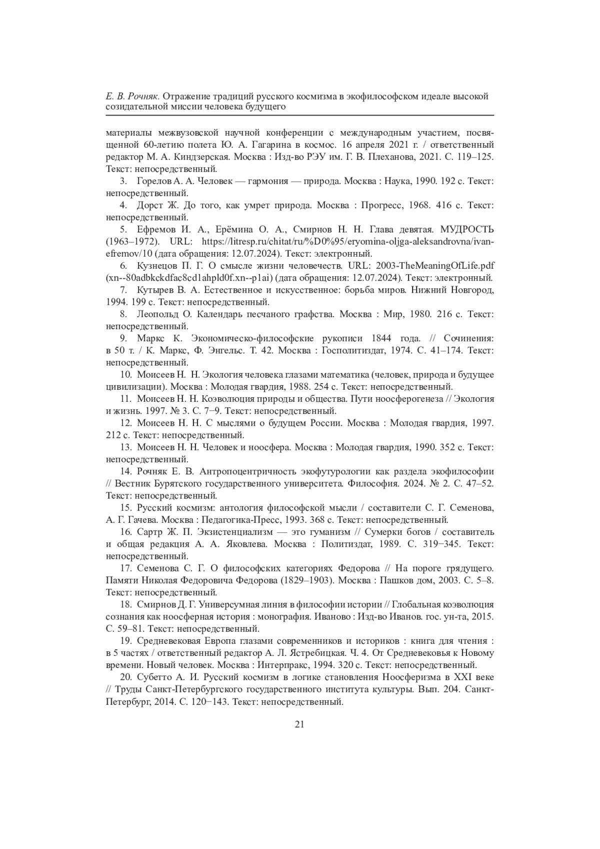 14. Рочняк Е. В. Антропоцентричность экофутурологии как раздела экофилософии // Вестник Бурятского государственного университета. Философия. 2024. № 2. С. 47-52. Текст: непосредственный.