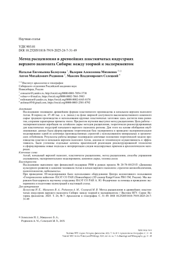 Исследование посвящено древнейшим формам пластинчатого производства в начальном верхнем палеолите Алтая. В период ок. 47–40 тыс. л. н. (некал.) на фоне широкой доступности высококачественного каменного сырья традиции производства и использования крупных пластинчатых заготовок здесь достигли пика развития, сохранив характерные приметы эпохи. Предметом изучения выступил метод расщепления. Цель работы – экспериментальная апробация на алтайском сырье методов расщепления, теоретически реконструированных для пластинчатых индустрий начального верхнего палеолита региона. Для этого на основе обобщения опубликованных данных была сформулирована теоретическая база эксперимента и проведено экспериментальное моделирование одной из ключевых производственных стратегий с использованием минеральных и органических отбойников. Результаты работы впервые подтвердили ключевые положения теоретической модели производства пластин в начальном верхнем палеолите Алтая, доказав ее техническую осуществимость и эффективность. Были уточнены отдельные аспекты практической реализации реконструированной технологии и сформулированы новые подходы к интерпретации следов моделируемых приемов в археологическом материале.