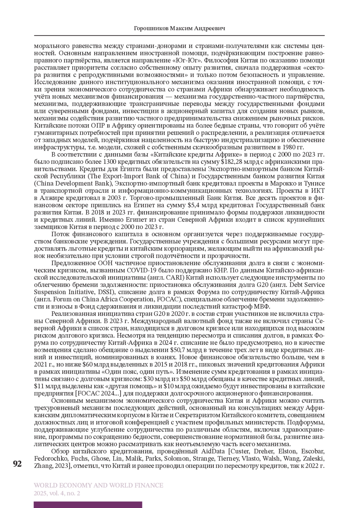 Целью статьи является анализ растущего присутствия Китая на африканском континенте через призму возможного финансового неоколониализма. С методологической точки зрения исследование основано на всестороннем анализе данных, а также работах исследователей, которые постулируют или опровергают аргументы о финансовом неоколониальном влиянии. В статье систематизированы и рассмотрены модели и механизмы финансово-экономического сотрудничества между странами Северной Африки и Китаем. Выделены следующие контрактные модели: модель особых экономических зон, модель государственно-частных партнёрств, модели соглашений о разделе продукции, модели концессионных соглашений, модель «ресурсы в обмен на инфраструктуру» и модели экспорта производственных рабочих мест из Китая в Африку. Механизмы финансово-экономического сотрудничества рассмотрены с точки зрения кредитного финансирования и официальной помощи развитию странам. Выделено отличие в предоставлении помощи КНР от принятой процедуры предоставления помощи членами ОЭСР. Обоснована необходимость учёта новых механизмов финансирования — механизма государственно-частного партнёрства, механизма, поддерживающего трансграничные переводы между государственными/суверенными фондами, механизма содействия развитию частного предпринимательства снижением рыночных рисков. Отмечена необходимость разработки/совершенствования правовой базы государственно-частного партнёрства в африканских странах.