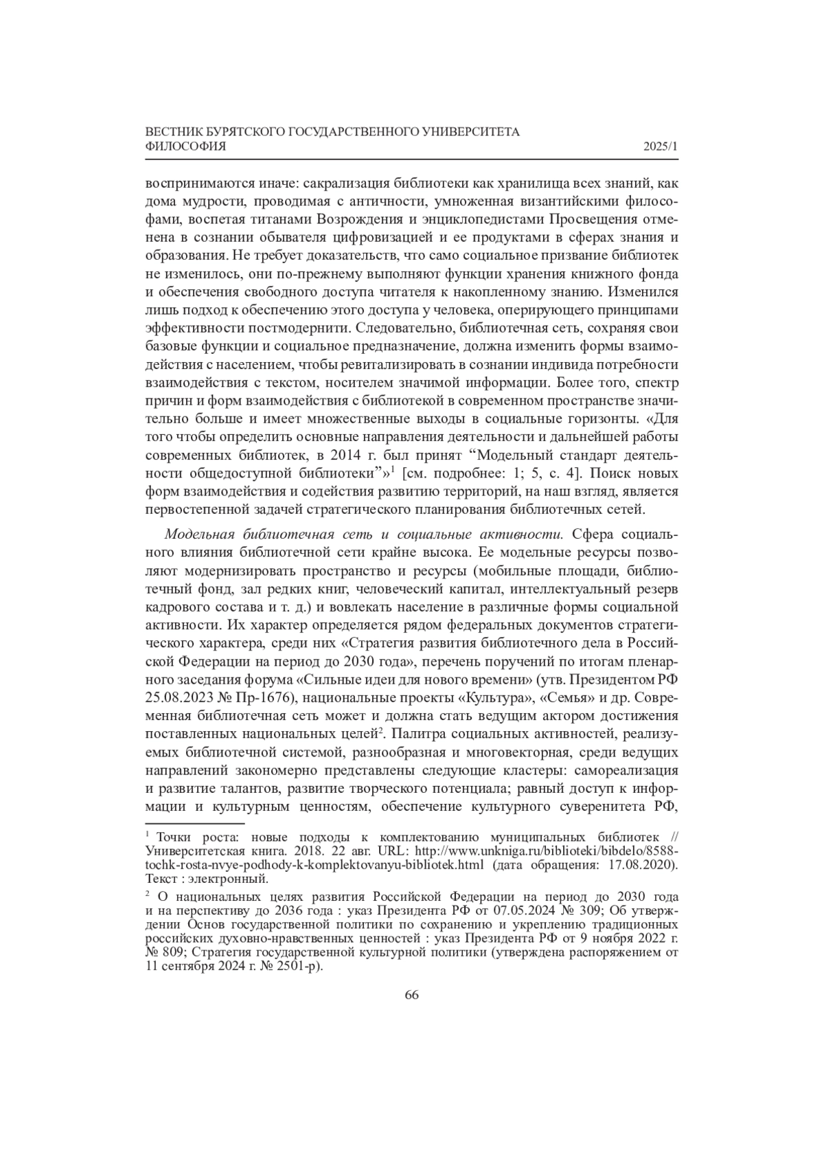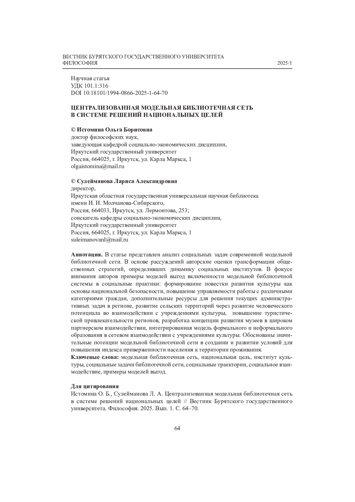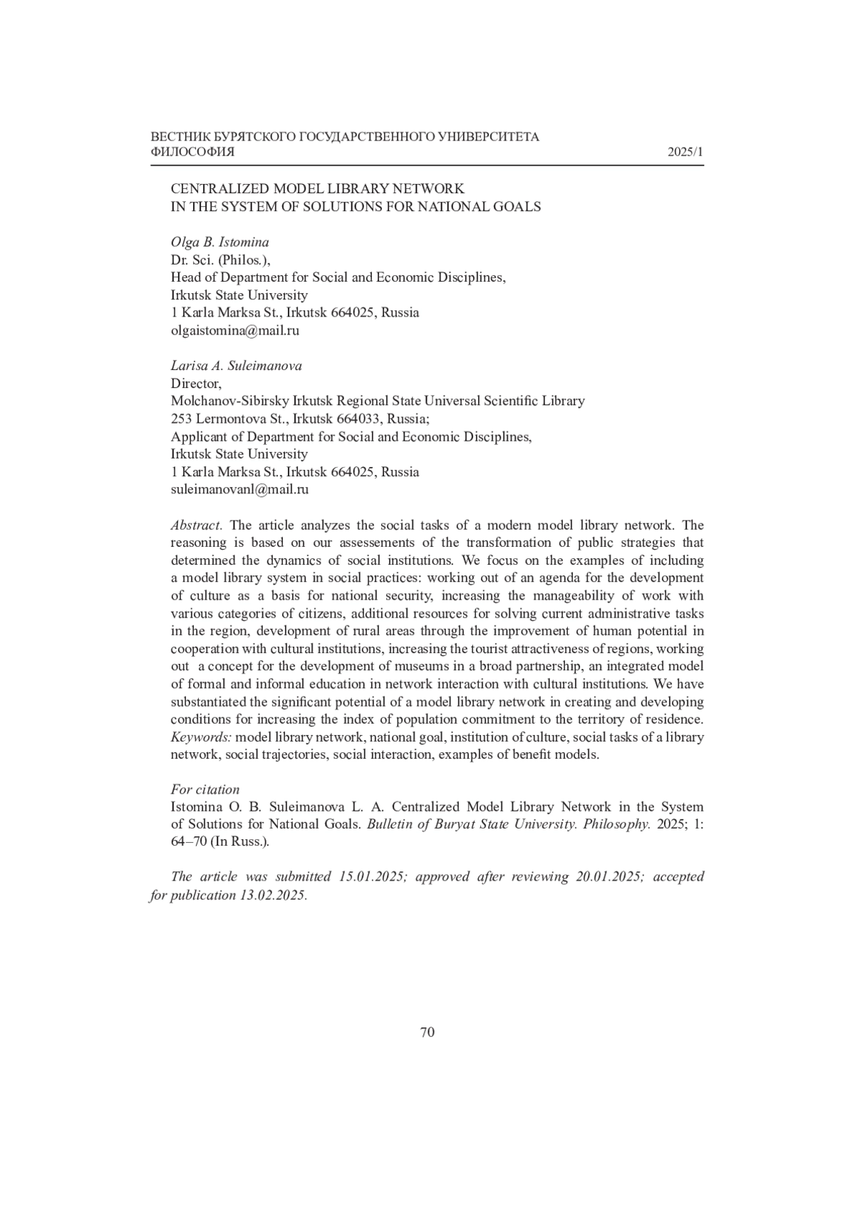 В статье представлен анализ социальных задач современной модельной библиотечной сети. В основе рассуждений авторские оценки трансформации общественных стратегий, определивших динамику социальных институтов. В фокусе внимания авторов примеры моделей выгод включенности модельной библиотечной системы в социальные практики: формирование повестки развития культуры как основы национальной безопасности, повышение управляемости работы с различными категориями граждан, дополнительные ресурсы для решения текущих административных задач в регионе, развитие сельских территорий через развитие человеческого потенциала во взаимодействии с учреждениями культуры, повышение туристической привлекательности регионов, разработка концепции развития музеев в широком партнерском взаимодействии, интегрированная модель формального и неформального образования в сетевом взаимодействии с учреждениями культуры. Обоснованы значительные потенции модельной библиотечной сети в создании и развитии условий для повышения индекса приверженности населения к территории проживания.