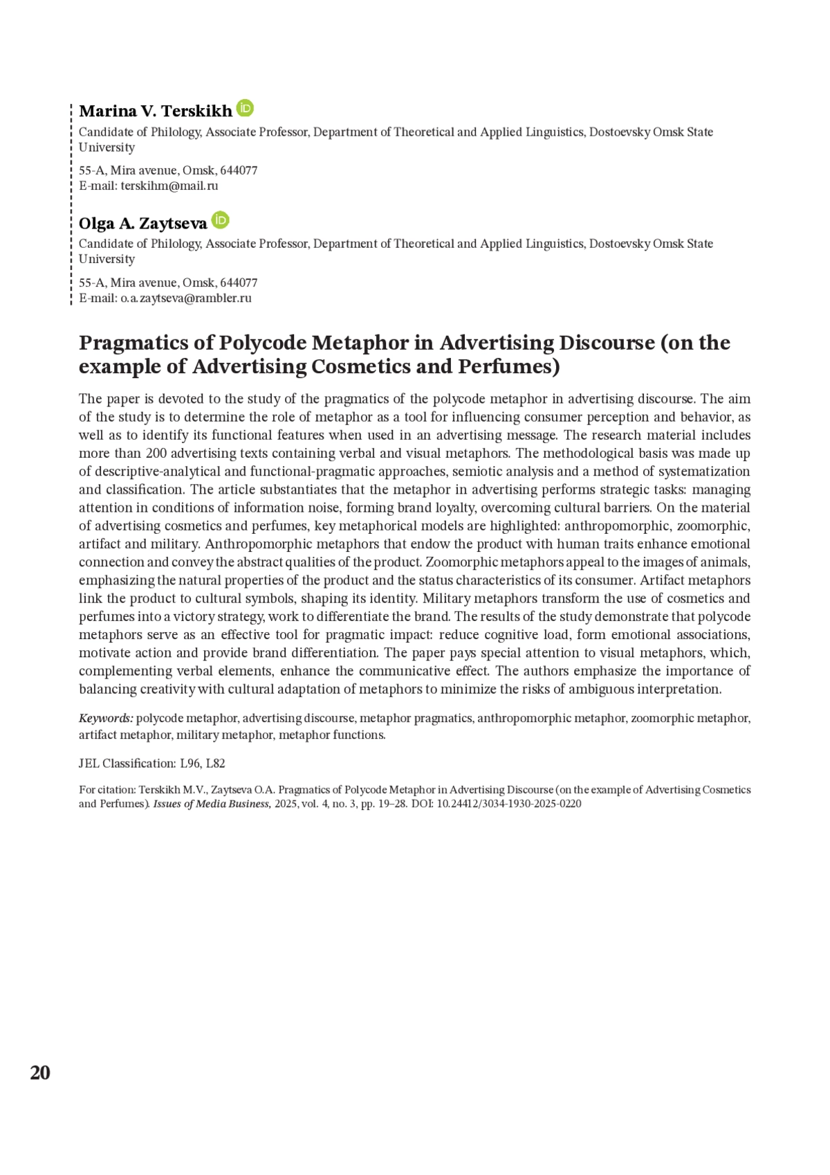Статья посвящена изучению прагматики поликодовой метафоры в рекламном дискурсе. Цель исследования заключается в определении роли метафоры как инструмента влияния на восприятие и поведение потребителей, а также в выявлении ее функциональных особенностей при использовании в рекламном сообщении. Материал исследования включает более 200 рекламных текстов, содержащих вербальные и визуальные метафоры. Методологическую основу составили описательно-аналитический и функционально-прагматический подходы, семиотический анализ и метод систематизации и классификации. В статье обосновывается, что метафора в рекламе выполняет стратегические задачи: управление вниманием в условиях информационного шума, формирование лояльности к бренду, преодоление культурных барьеров. На материале рекламы косметики и парфюмерии выделены ключевые метафорические модели: антропоморфная, зооморфная, артефактная и милитарная. Антропоморфные метафоры, наделяющие продукт человеческими чертами, усиливают эмоциональную связь и передают абстрактные качества продукта. Зооморфные метафоры апеллируют к образам животных, подчеркивая природные свойства продукта и статусные характеристики его потребителя. Артефактные метафоры связывают продукт с культурными символами, формируя его идентичность. Милитарные метафоры трансформируют использование косметики и парфюмерии в стратегию победы, работают на дифференциацию бренда. Результаты исследования демонстрируют, что поликодовые метафоры служат эффективным инструментом прагматического воздействия: сокращают когнитивную нагрузку, формируют эмоциональные ассоциации, мотивируют к действию и обеспечивают дифференциацию бренда. Особое внимание в статье уделяется визуальным метафорам, которые, дополняя вербальные элементы, усиливают коммуникативный эффект. Авторы подчеркивают важность баланса между креативностью и культурной адаптацией метафор для минимизации рисков неоднозначной интерпретации.