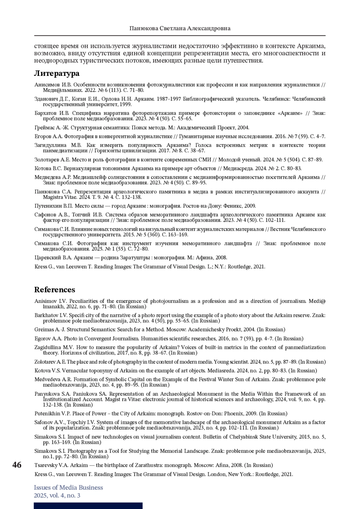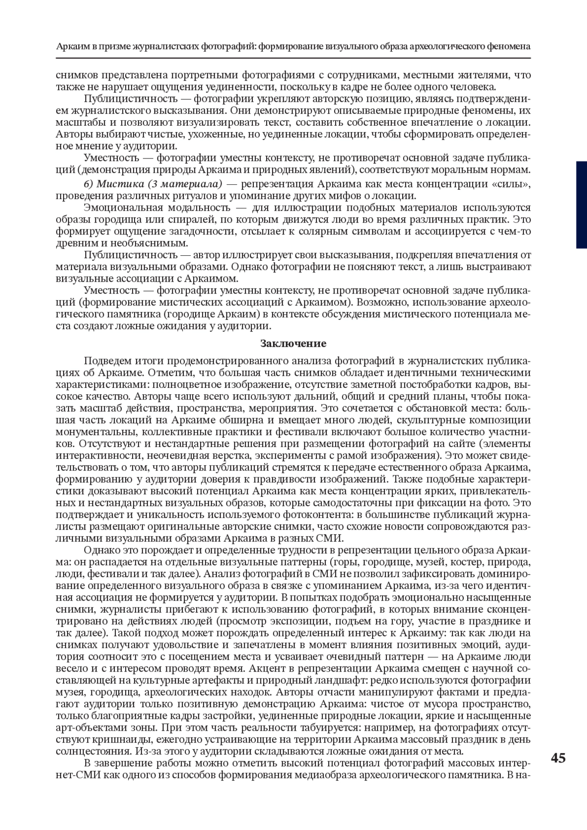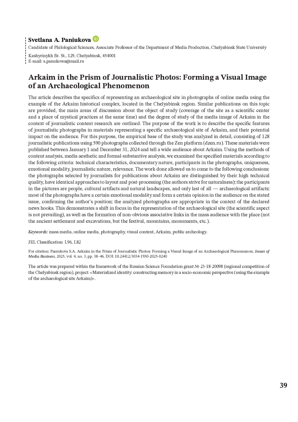 Статья описывает специфику репрезентации археологического памятника в фотографиях сетевых СМИ. В качестве примера выбран челябинский (Россия) исторический комплекс Аркаим. Приводятся схожие публикации по данной теме, обозначаются основные направления дискуссии об объекте исследования (освещение памятника как научного центра и места мистических практик одновременно) и степень изученности медиаобраза Аркаима в контексте исследований журналистского контента. Цель работы — описание специфических особенностей журналистских фотографий в материалах, репрезентующих конкретный археологический памятник Аркаим, и их потенциального влияния на аудиторию. Для этого была подробно проанализирована эмпирическая база исследования, состоящая из 128 журналистских публикаций с использованием 590 фотографий, собранных посредством платформы «Дзен» (dzen. ru). Данные материалы были опубликованы в период с 1 января по 31 декабря 2024 г. и рассказывают об Аркаиме широкой аудитории. Использовав методы контент-анализа, медиаэстетического и формально-содержательного анализов, мы рассмотрели указанные материалы по следующим критериям: технические характеристики, документальность, участники фотографий, уникальность, эмоциональная модальность, публицистичность, уместность. Проделанная работа позволила прийти к следующим выводам: фотографии, отобранные журналистами для публикаций об Аркаиме, отличаются своим высоким техническим качеством, имеют идентичные подходы к верстке и постобработке (авторы стремятся к естественности); участниками снимков становятся люди, культурные артефакты и природный ландшафт и лишь в последнюю очередь — археологические артефакты; большая часть фотографий имеет определенную эмоциональную модальность и формирует у аудитории определенное мнение по заявленному вопросу, подтверждает авторскую позицию; проанализированные снимки уместны в контексте заявленных инфоповодов. Это демонстрирует смещение фокуса в репрезентации археологического памятника (научный аспект не является превалирующим), а также формирование неочевидных ассоциативных связей у массовой аудитории с местом (не городище и раскопки, а фестиваль, горы, памятники и прочее).