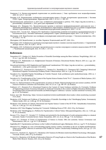 18. Шестерина А.М. Особенности и проблемы популяризации научного знания в системе видеоблогинга // Современный дискурс-анализ. 2021. № 2 (28). С. 49-56.