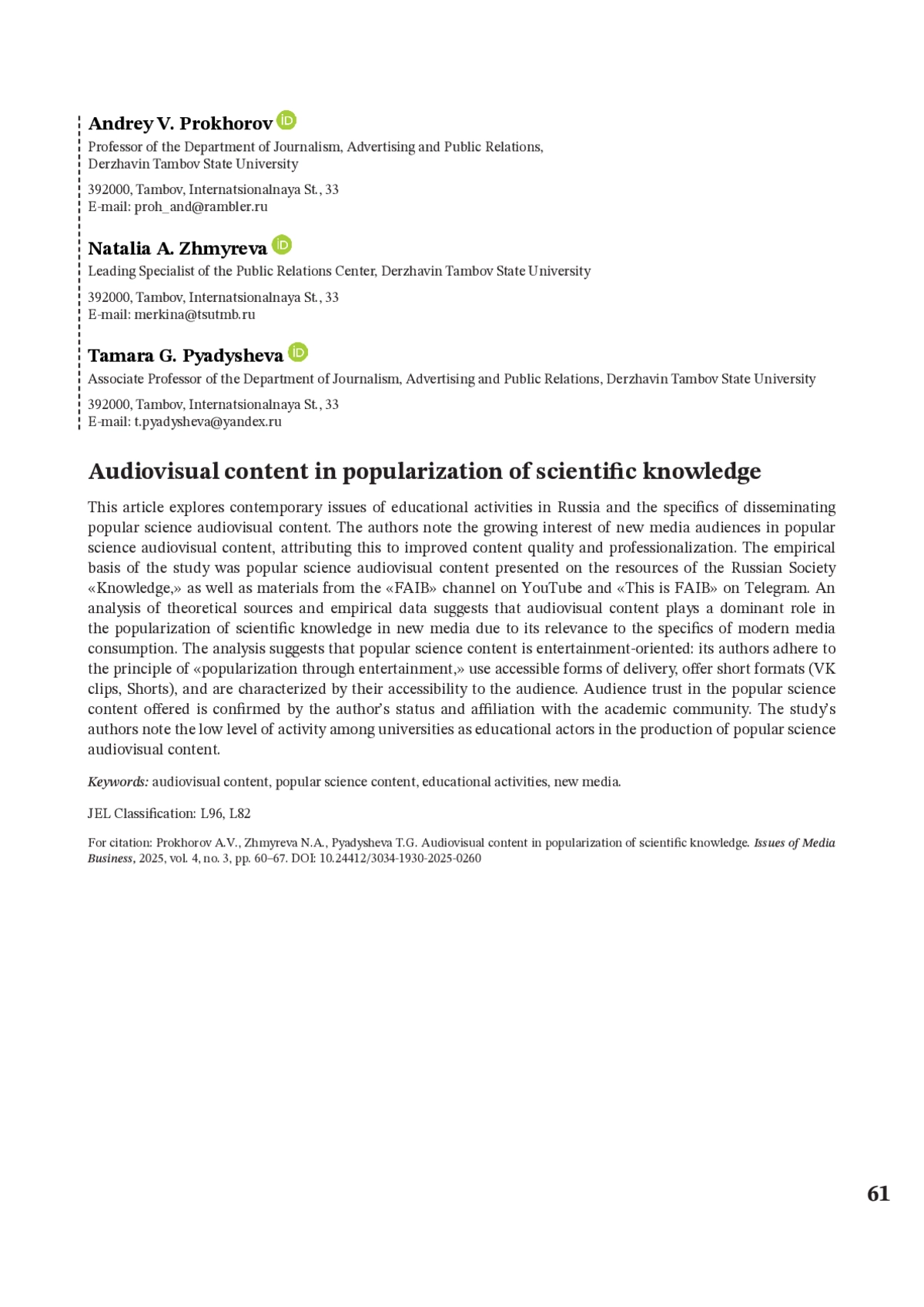 Статья посвящена современным проблемам просветительской деятельности в России, специфике распространения научно-популярного аудиовизуального контента. Авторы отмечают растущий интерес аудитории новых медиа к научно-популярному аудиовизуальному контенту, связывая его с повышением качества контента, его профессионализацией. Эмпирической базой исследования выступил научнопопулярный аудиовизуальный контент, представленный на ресурсах Российского общества «Знание», а также материалы канала «Файб» на платформе Youtube и «Это Файб» в Телеграм. Анализ теоретических источников и эмпирического материала позволяет говорить о том, что аудиовизуальный контент занимает доминирующую роль в популяризации научного знания в новых медиа по причине соответствия специфике современного медиапотребления. Проведенный анализ позволяет говорить о развлекательной направленности научно-популярного контента: его авторы придерживаются принципа «популяризация через развлечение», используют доступные формы подачи, предлагают короткие форматы (ВК-клипы, Shorts), научно-популярный аудиовизуальный контент характеризуется доступностью для аудитории. Доверие аудитории к предлагаемому научно-популярному контенту подтверждается статусом автора, его принадлежностью к академическому сообществу. Авторы исследования отмечают низкую активность вузов как акторов просветительской работы по производству научно-популярного аудиовизуального контента.